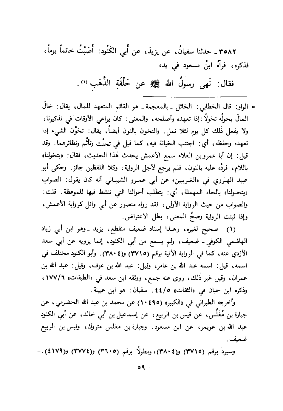 ٣٥٨٢ - حَدَّثَنَا سُفْيَانُ، عَنْ يَزِيدَ، عَنْ أَبِي الْكَنُودِ: أَصَبْتُ خَاتَمًا يَوْمًا، فَذَكَرَهُ فَرَآهُ ابْنُ مَسْعُودٍ فِي يَدِهِ فَقَالَ: " نَهَى رَسُولُ اللهِ صَلَّى اللهُ عَلَيْهِ وَسَلَّمَ عَنْ حَلَقَةِ الذَّهَبِ (١) "