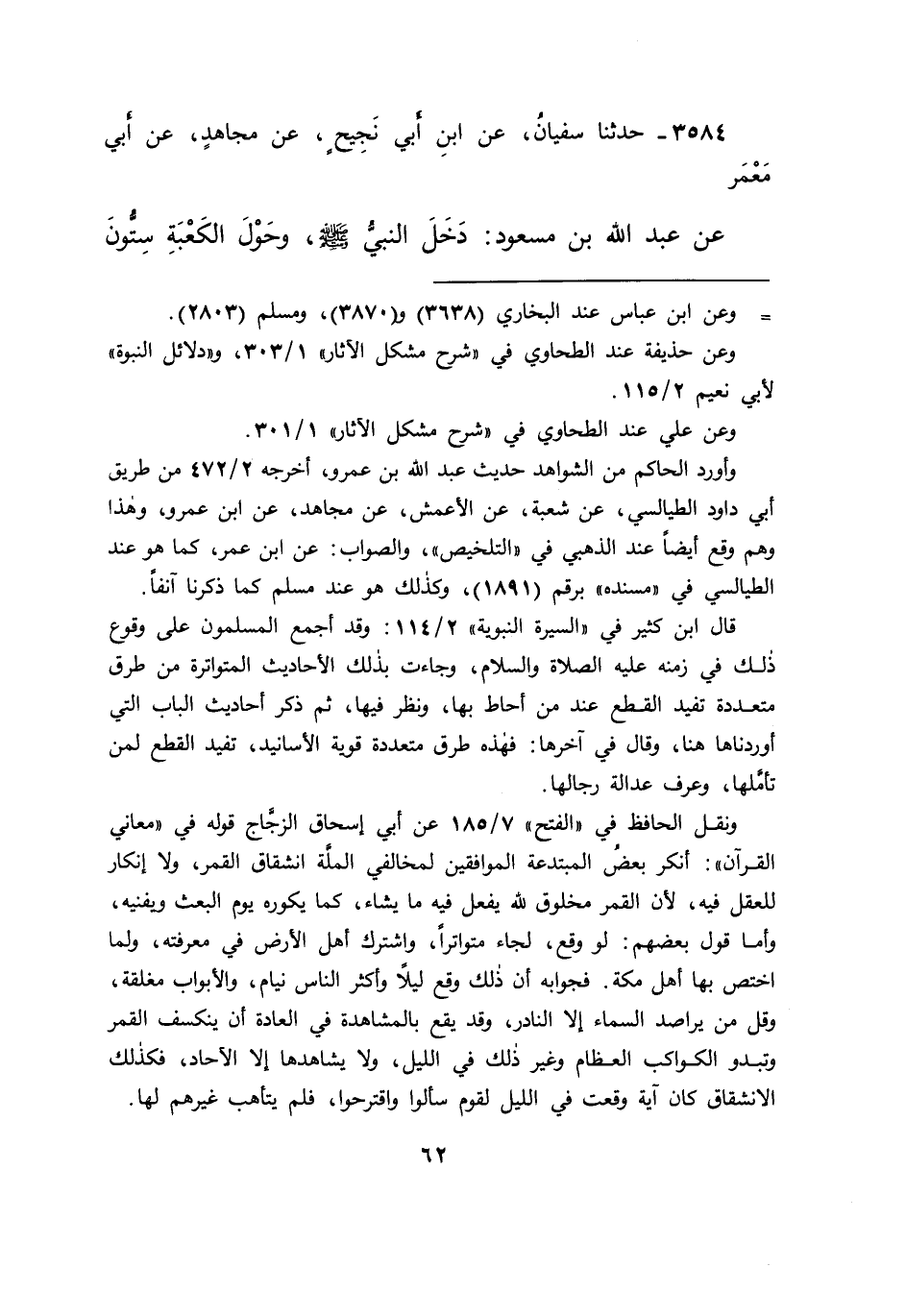 ٣٥٨٤ - حَدَّثَنَا سُفْيَانُ، عَنْ ابْنِ أَبِي نَجِيحٍ، عَنْ مُجَاهِدٍ، عَنْ أَبِي مَعْمَرٍ، عَنْ عَبْدِ اللهِ بْنِ مَسْعُودٍ: دَخَلَ النَّبِيُّ صَلَّى اللهُ عَلَيْهِ وَسَلَّمَ، وَحَوْلَ الْكَعْبَةِ سِتُّونَ