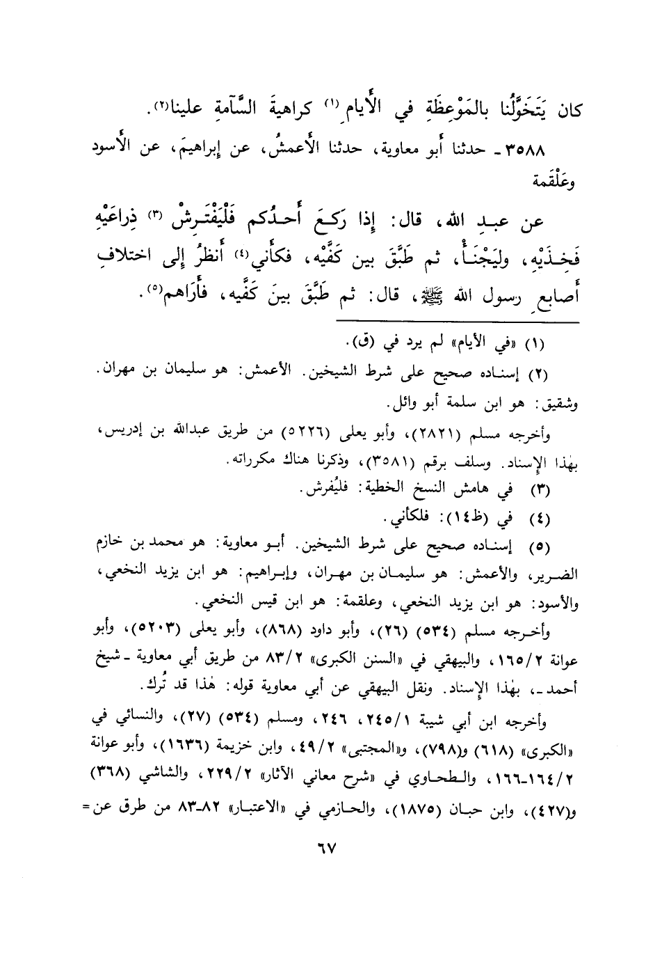٣٥٨٨ - حَدَّثَنَا أَبُو مُعَاوِيَةَ، حَدَّثَنَا الْأَعْمَشُ، عَنْ إِبْرَاهِيمَ، عَنْ الْأَسْوَدِ، وَعَلْقَمَةَ، عَنْ عَبْدِ اللهِ، قَالَ: " إِذَا رَكَعَ أَحَدُكُمْ فَلْيُفْرِشْ (٣) ذِرَاعَيْهِ فَخِذَيْهِ، وَلْيَجْنَأْ، ثُمَّ طَبَّقَ بَيْنَ كَفَّيْهِ، فَكَأَنِّي (٤) أَنْظُرُ إِلَى اخْتِلَافِ أَصَابِعِ رَسُولِ اللهِ صَلَّى اللهُ عَلَيْهِ وَسَلَّمَ، قَالَ: ثُمَّ طَبَّقَ بَيْنَ كَفَّيْهِ، فَأَرَاهُمْ " (٥)