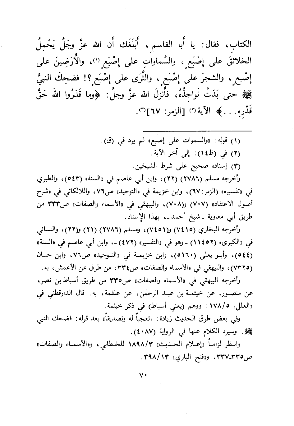 الْكِتَابِ، فَقَالَ: يَا أَبَا الْقَاسِمِ، أَبَلَغَكَ أَنَّ اللهَ عَزَّ وَجَلَّ يَحْمِلُ الْخَلَائِقَ عَلَى أُصْبُعٍ، وَالسَّمَاوَاتِ عَلَى أُصْبُعٍ (١) ، وَالْأَرَضِينَ عَلَى أُصْبُعٍ، وَالشَّجَرَ عَلَى أُصْبُعٍ، وَالثَّرَى عَلَى أُصْبُعٍ؟ " فَضَحِكَ النَّبِيُّ صَلَّى اللهُ عَلَيْهِ وَسَلَّمَ حَتَّى بَدَتْ نَوَاجِذُهُ "، فَأَنْزَلَ اللهُ عَزَّ وَجَلَّ: {وَمَا قَدَرُوا اللهَ حَقَّ قَدْرِهِ} الْآيَةَ