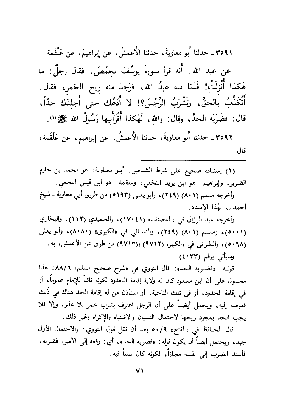 ٣٥٩١ - حَدَّثَنَا أَبُو مُعَاوِيَةَ، حَدَّثَنَا الْأَعْمَشُ، عَنْ إِبْرَاهِيمَ، عَنْ عَلْقَمَةَ، عَنْ عَبْدِ اللهِ، أَنَّهُ قَرَأَ سُورَةَ يُوسُفَ بِحِمْصَ، فَقَالَ رَجُلٌ: مَا هَكَذَا أُنْزِلَتْ فَدَنَا مِنْهُ عَبْدُ اللهِ، فَوَجَدَ مِنْهُ رِيحَ الْخَمْرِ، فَقَالَ: أَتُكَذِّبُ بِالْحَقِّ، وَتَشْرَبُ الرِّجْسَ؟ لَا أَدَعُكَ حَتَّى أَجْلِدَكَ حَدًّا، قَالَ: فَضَرَبَهُ الْحَدَّ، وَقَالَ: " وَاللهِ، لَهَكَذَا أَقْرَأَنِيهَا رَسُولُ اللهِ صَلَّى اللهُ عَلَيْهِ وَسَلَّمَ " (١)