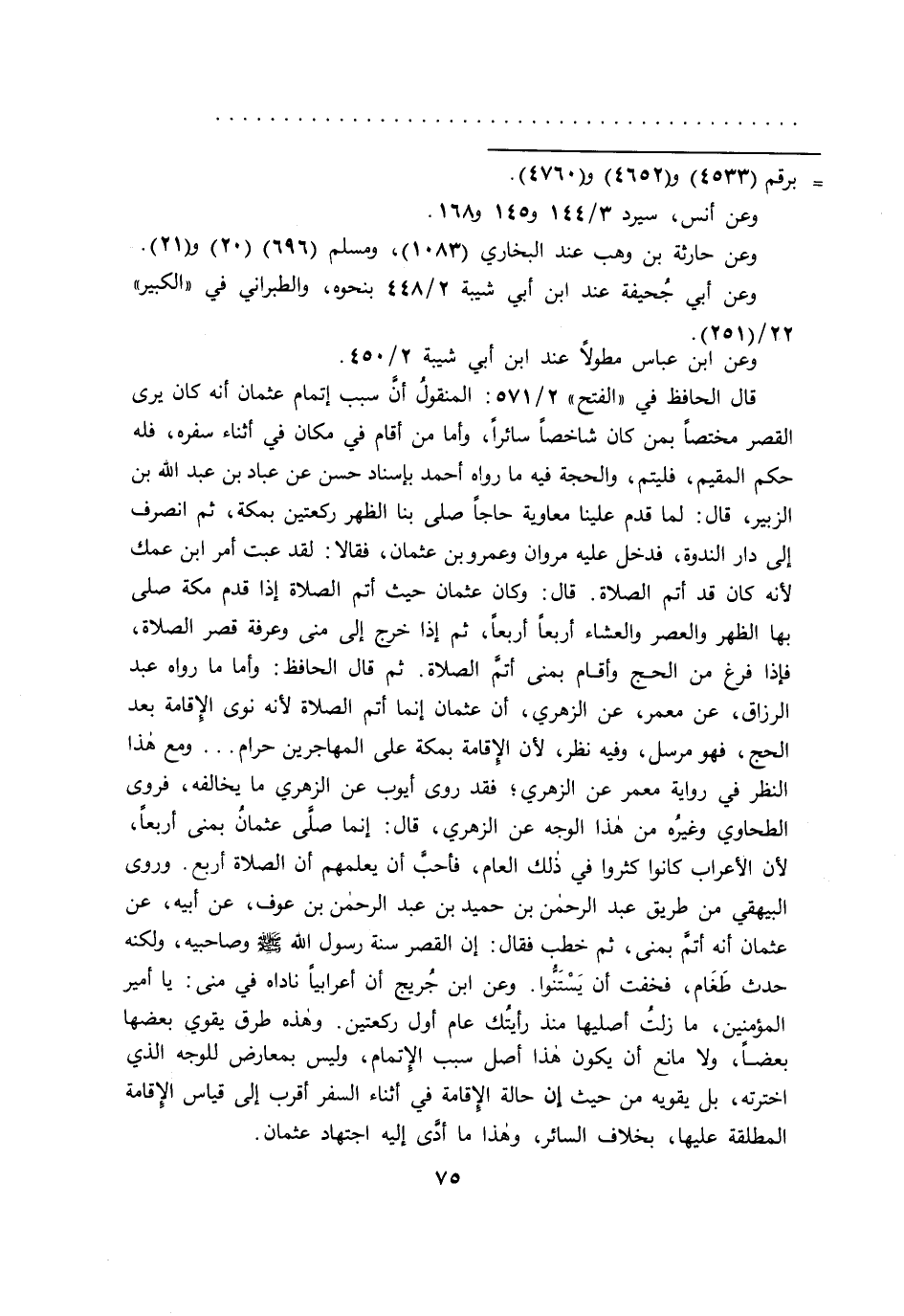 قال الحافظ في "الفتح" ٢/٥٧١: المنقول أن سبب إتمام عثمان أنه كان يرى القصر مختصاً بمن كان شاخصاً سائراً، وأما من أقام في مكان في أثناء سفره، فله حكم المقيم، فليتم، والحجة فيه ما رواه أحمد بإسناد حسن عن عباد بن عبد الله بن الزبير، قال: لما قدم علينا معاوية حاجاً صلى بنا الظهر ركعتين بمكة، ثم انصرف إلى دار الندوة، فدخل عليه مروان وعمرو بن عثمان، فقالا: لقد عبت أمر ابن عمك لأنه كان قد أتم الصلاة. قال: وكان عثمان حيث أتم الصلاة إذا قدم مكة صلى بها الظهر والعصر والعشاء أربعاً أربعاً، ثم إذا خرج إلى منى وعرفة قصر الصلاة، فإذا فرغ من الحج وأقام بمنى أتم الصلاة. ثم قال الحافظ: وأما ما رواه عبد الرزاق، عن معمر، عن الزهري، أن عثمان إنما أتم الصلاة لأنه نوى الإِقامة بعد الحج، فهو مرسل، وفيه نظر، لأن الإِقامة بمكة على المهاجرين حرام ... ومع هذا النظر في رواية معمر عن الزهري؛ فقد روى أيوب عن الزهري ما يخالفه، فروى الطحاوي وغيره من هذا الوجه عن الزهري، قال: إنما صلى عثمان بمنى أربعاً، لأن الأعراب كانوا كثروا في ذلك العام، فأحث أن يعلمهم أن الصلاة أربع. وروى البيهقي من طريق عبد الرحمن بن حميد بن عبد الرحمن بن عوف، عن أبيه، عن عثمان أنه أتم بمنى، ثم خطب فقال: إن القصر سنة رسول الله صَلَّى اللهُ عَلَيْهِ وَسَلَّمَ وصاحبيه، ولكنه حدث طَغَام، فخفت أن يستنوا. وعن ابن جريج أن أعرابياً ناداه في منى: يا أمير المؤمنين، ما زلت أصليها منذ رأيتك عام أول ركعتين. وهذه طرق يقوي بعضها بعضاً، ولا مانع أن يكون هذا أصل سبب الإِتمام، وليس بمعارض للوجه الذي اخترته، بل يقويه من حيث إن حالة الإقامة في أثناء السفر أقرب إلى قياس الإِقامة المطلقة عليها، بخلاف السائر، وهذا ما أدى إليه اجتهاد عثمان.