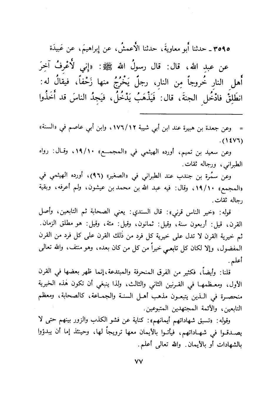 ٣٥٩٥ - حَدَّثَنَا أَبُو مُعَاوِيَةَ، حَدَّثَنَا الْأَعْمَشُ، عَنْ إِبْرَاهِيمَ، عَنْ عَبِيدَةَ، عَنْ عَبْدِ اللهِ، قَالَ: قَالَ رَسُولُ اللهِ صَلَّى اللهُ عَلَيْهِ وَسَلَّمَ: " إِنِّي لَأَعْرِفُ آخِرَ أَهْلِ النَّارِ خُرُوجًا مِنَ النَّارِ، رَجُلٌ يَخْرُجُ مِنْهَا زَحْفًا، فَيُقَالُ لَهُ: " انْطَلِقْ فَادْخُلِ الْجَنَّةَ، قَالَ: فَيَذْهَبُ يَدْخُلُ، فَيَجِدُ النَّاسَ قَدْ أَخَذُوا