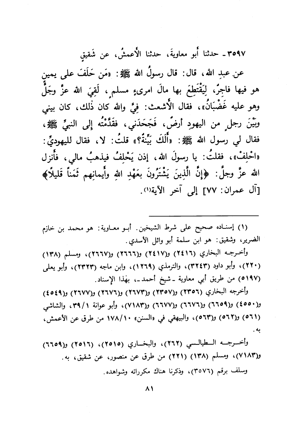 ٣٥٩٧ - حَدَّثَنَا أَبُو مُعَاوِيَةَ، حَدَّثَنَا الْأَعْمَشُ، عَنْ شَقِيقٍ، عَنْ عَبْدِ اللهِ، قَالَ: قَالَ رَسُولُ اللهِ صَلَّى اللهُ عَلَيْهِ وَسَلَّمَ: " مَنْ حَلَفَ عَلَى يَمِينٍ هُوَ فِيهَا فَاجِرٌ، لِيَقْتَطِعَ بِهَا مَالَ امْرِئٍ مُسْلِمٍ، لَقِيَ اللهَ عَزَّ وَجَلَّ وَهُوَ عَلَيْهِ غَضْبَانُ "، فَقَالَ الْأَشْعَثُ: فِيَّ وَاللهِ كَانَ ذَلِكَ، كَانَ بَيْنِي وَبَيْنَ رَجُلٍ مِنَ الْيَهُودِ أَرْضٌ، فَجَحَدَنِي، فَقَدَّمْتُهُ إِلَى النَّبِيِّ صَلَّى اللهُ عَلَيْهِ وَسَلَّمَ، فَقَالَ لِي رَسُولُ اللهِ صَلَّى اللهُ عَلَيْهِ وَسَلَّمَ: " أَلَكَ بَيِّنَةٌ؟ " قُلْتُ: لَا، فَقَالَ لِلْيَهُودِيِّ: " احْلِفْ "، فَقُلْتُ: يَا رَسُولَ اللهِ، إِذَنْ يَحْلِفَ فَيَذْهَبَ مَالِي، فَأَنْزَلَ اللهُ عَزَّ وَجَلَّ: {إِنَّ الَّذِينَ يَشْتَرُونَ بِعَهْدِ اللهِ وَأَيْمَانِهِمْ ثَمَنًا قَلِيلًا} [آل عمران: ٧٧] إِلَى آخِرِ الْآيَةِ (١)