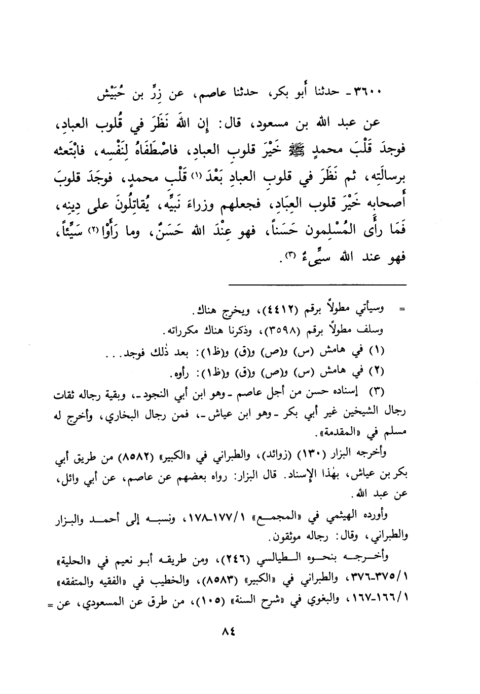 ٣٦٠٠ - حَدَّثَنَا أَبُو بَكْرٍ، حَدَّثَنَا عَاصِمٌ، عَنْ زِرِّ بْنِ حُبَيْشٍ، عَنْ عَبْدِ اللهِ بْنِ مَسْعُودٍ، قَالَ: " إِنَّ اللهَ نَظَرَ فِي قُلُوبِ الْعِبَادِ، فَوَجَدَ قَلْبَ مُحَمَّدٍ صَلَّى اللهُ عَلَيْهِ وَسَلَّمَ خَيْرَ قُلُوبِ الْعِبَادِ، فَاصْطَفَاهُ لِنَفْسِهِ، فَابْتَعَثَهُ بِرِسَالَتِهِ، ثُمَّ نَظَرَ فِي قُلُوبِ الْعِبَادِ بَعْدَ (١) قَلْبِ مُحَمَّدٍ، فَوَجَدَ قُلُوبَ أَصْحَابِهِ خَيْرَ قُلُوبِ الْعِبَادِ، فَجَعَلَهُمْ وُزَرَاءَ نَبِيِّهِ، يُقَاتِلُونَ عَلَى دِينِهِ، فَمَا رَأَى الْمُسْلِمُونَ حَسَنًا، فَهُوَ عِنْدَ اللهِ حَسَنٌ، وَمَا رَأَوْا سَيِّئًا (٢) فَهُوَ عِنْدَ اللهِ سَيِّئٌ " (٣)