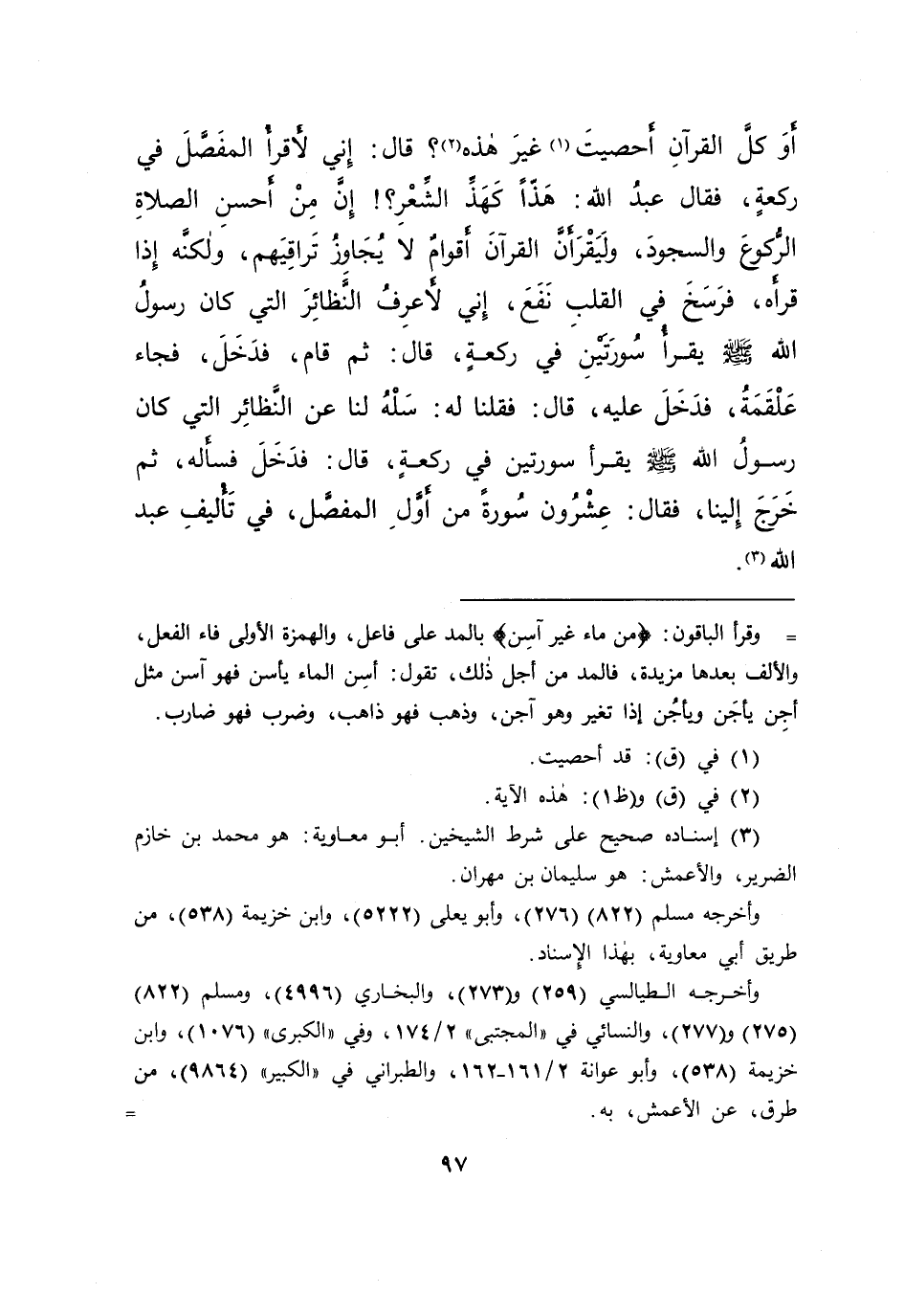 أَوَكُلَّ الْقُرْآنِ أَحْصَيْتَ (١) غَيْرَ هَذِهِ (٢) ؟ قَالَ: إِنِّي لَأَقْرَأُ الْمُفَصَّلَ فِي رَكْعَةٍ، فَقَالَ عَبْدُ اللهِ: هَذًّا كَهَذِّ الشِّعْرِ؟ إِنَّ مِنْ أَحْسَنِ الصَّلَاةِ الرُّكُوعَ وَالسُّجُودَ، وَلَيَقْرَأَنَّ الْقُرْآنَ أَقْوَامٌ لَا يُجَاوِزُ تَرَاقِيَهُمْ، وَلَكِنَّهُ إِذَا قَرَأَهُ، فَرَسَخَ فِي الْقَلْبِ نَفَعَ، إِنِّي لَأَعْرِفُ النَّظَائِرَ الَّتِي كَانَ رَسُولُ اللهِ صَلَّى اللهُ عَلَيْهِ وَسَلَّمَ يَقْرَأُ سُورَتَيْنِ فِي رَكْعَةٍ، قَالَ: ثُمَّ قَامَ، فَدَخَلَ، فَجَاءَ عَلْقَمَةُ، فَدَخَلَ عَلَيْهِ، قَالَ: فَقُلْنَا لَهُ: سَلْهُ لَنَا عَنِ النَّظَائِرِ الَّتِي كَانَ رَسُولُ اللهِ صَلَّى اللهُ عَلَيْهِ وَسَلَّمَ يَقْرَأُ سُورَتَيْنِ فِي رَكْعَةٍ، قَالَ: فَدَخَلَ فَسَأَلَهُ، ثُمَّ خَرَجَ إِلَيْنَا، فَقَالَ: " عِشْرُونَ سُورَةً مِنْ أَوَّلِ الْمُفَصَّلِ "، فِي تَأْلِيفِ عَبْدِ اللهِ (٣)