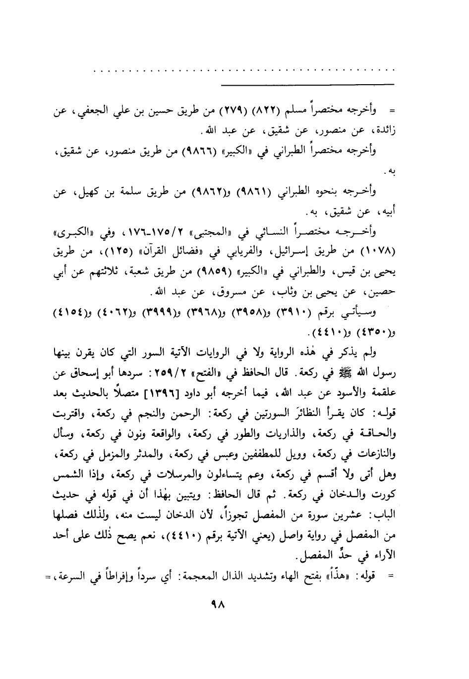 ولم يذكر في هذه الرواية ولا في الروايات الآتية السور التي كان يقرن بينها رسول الله صَلَّى اللهُ عَلَيْهِ وَسَلَّمَ في ركعة. قال الحافظ في "الفتح" ٢/٢٥٩: سردها أبو إسحاق عن علقمة والأسود عن عبد الله، فيما أخرجه أبو داود [١٣٩٦] متصلاً بالحديث بعد قوله: كان يقرأ النظائرَ السورتين في ركعة: الرحمن والنجم في ركعة، واقتربت والحاقة في ركعة، والذاريات والطور في ركعة، والواقعة ونون في ركعة، وسأل والنازعات في ركعة، وويل للمطففين وعبس في ركعة، والمدثر والمزمل في ركعة، وهل أتى ولا أقسم في ركعة، وعم يتساءلون والمرسلات في ركعة، وإذا الشمس كورت والدخان في ركعة. ثم قال الحافظ: ويتبين بهذا أن في قوله في حديث الباب: عشرين سورة من المفصل تجوزا، لأن الدخان ليست منه، ولذلك فصلها من المفصل في رواية واصل (يعني الآتية برقم (٤٤١٠)) ، نعم يصح ذلك على أحد الآراء في حد المفصل.