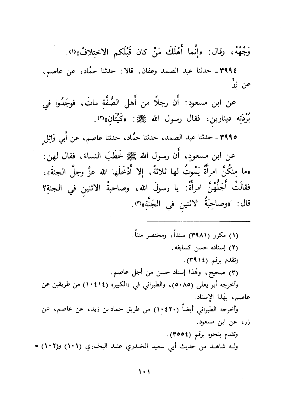 ٣٩٩٥ - حَدَّثَنَا عَبْدُ الصَّمَدِ، حَدَّثَنَا حَمَّادٌ، حَدَّثَنَا عَاصِمٌ، عَنْ أَبِي وَائِلٍ، عَنِ ابْنِ مَسْعُودٍ، أَنَّ رَسُولَ اللهِ صَلَّى اللهُ عَلَيْهِ وَسَلَّمَ خَطَبَ النِّسَاءَ، فَقَالَ لَهُنَّ: " مَا مِنْكُنَّ امْرَأَةٌ يَمُوتُ لَهَا ثَلَاثَةٌ، إِلَّا أَدْخَلَهَا اللهُ عَزَّ وَجَلَّ الْجَنَّةَ "، فَقَالَتْ أَجَلُّهُنَّ امْرَأَةً: يَا رَسُولَ اللهِ، وَصَاحِبَةُ الِاثْنَيْنِ فِي الْجَنَّةِ؟ قَالَ: " وَصَاحِبَةُ الِاثْنَيْنِ فِي الْجَنَّةِ " (٣)