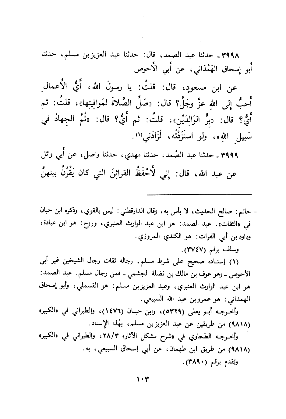 ٣٩٩٨ - حَدَّثَنَا عَبْدُ الصَّمَدِ، قَالَ: حَدَّثَنَا عَبْدُ الْعَزِيزِ بْنُ مُسْلِمٍ، حَدَّثَنَا أَبُو إِسْحَاقَ الْهَمْدَانِيُّ، عَنْ أَبِي الْأَحْوَصِ، عَنِ ابْنِ مَسْعُودٍ، قَالَ: قُلْتُ: يَا رَسُولَ اللهِ، أَيُّ الْأَعْمَالِ أَحَبُّ إِلَى اللهِ عَزَّ وَجَلَّ؟ قَالَ: " صَلِّ الصَّلَاةَ لِمَوَاقِيتِهَا "، قُلْتُ: ثُمَّ أَيُّ؟ قَالَ: " بِرُّ الْوَالِدَيْنِ "، قُلْتُ: ثُمَّ أَيُّ؟ قَالَ: " ثُمَّ الْجِهَادُ فِي سَبِيلِ اللهِ "، وَلَوِ اسْتَزَدْتُهُ لَزَادَنِي (١)
