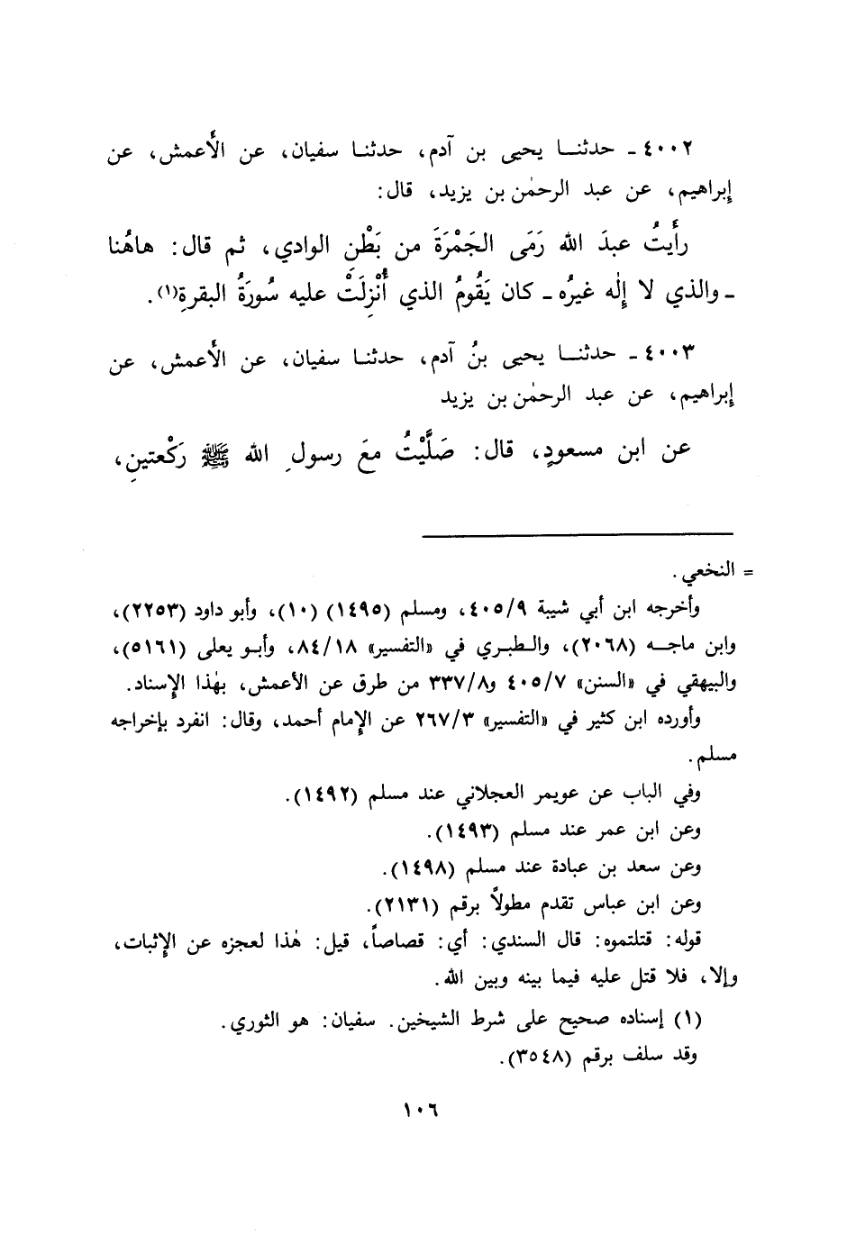 ٤٠٠٢ - حَدَّثَنَا يَحْيَى بْنُ آدَمَ، حَدَّثَنَا سُفْيَانُ، عَنِ الْأَعْمَشِ، عَنْ إِبْرَاهِيمَ، عَنْ عَبْدِ الرَّحْمَنِ بْنِ يَزِيدَ، قَالَ: رَأَيْتُ عَبْدَ اللهِ رَمَى الْجَمْرَةَ مِنْ بَطْنِ الْوَادِي، ثُمَّ قَالَ: " هَاهُنَا وَالَّذِي لَا إِلَهَ غَيْرُهُ، كَانَ يَقُومُ الَّذِي أُنْزِلَتْ عَلَيْهِ سُورَةُ الْبَقَرَةِ " (١)