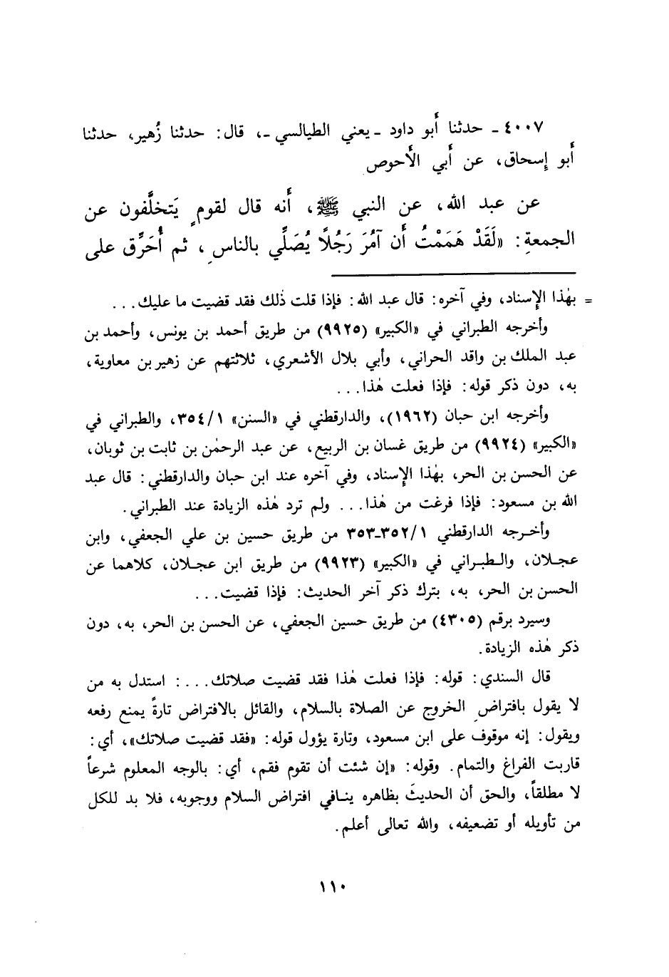 ٤٠٠٧ - حَدَّثَنَا أَبُو دَاوُدَ يَعْنِي الطَّيَالِسِيَّ، قَالَ: حَدَّثَنَا زُهَيْرٌ، حَدَّثَنَا أَبُو إِسْحَاقَ، عَنْ أَبِي الْأَحْوَصِ، عَنْ عَبْدِ اللهِ، عَنِ النَّبِيِّ صَلَّى اللهُ عَلَيْهِ وَسَلَّمَ، أَنَّهُ قَالَ لِقَوْمٍ يَتَخَلَّفُونَ عَنِ الْجُمُعَةِ: " لَقَدْ هَمَمْتُ أَنْ آمُرَ رَجُلًا يُصَلِّي بِالنَّاسِ، ثُمَّ أُحَرِّقَ عَلَى
