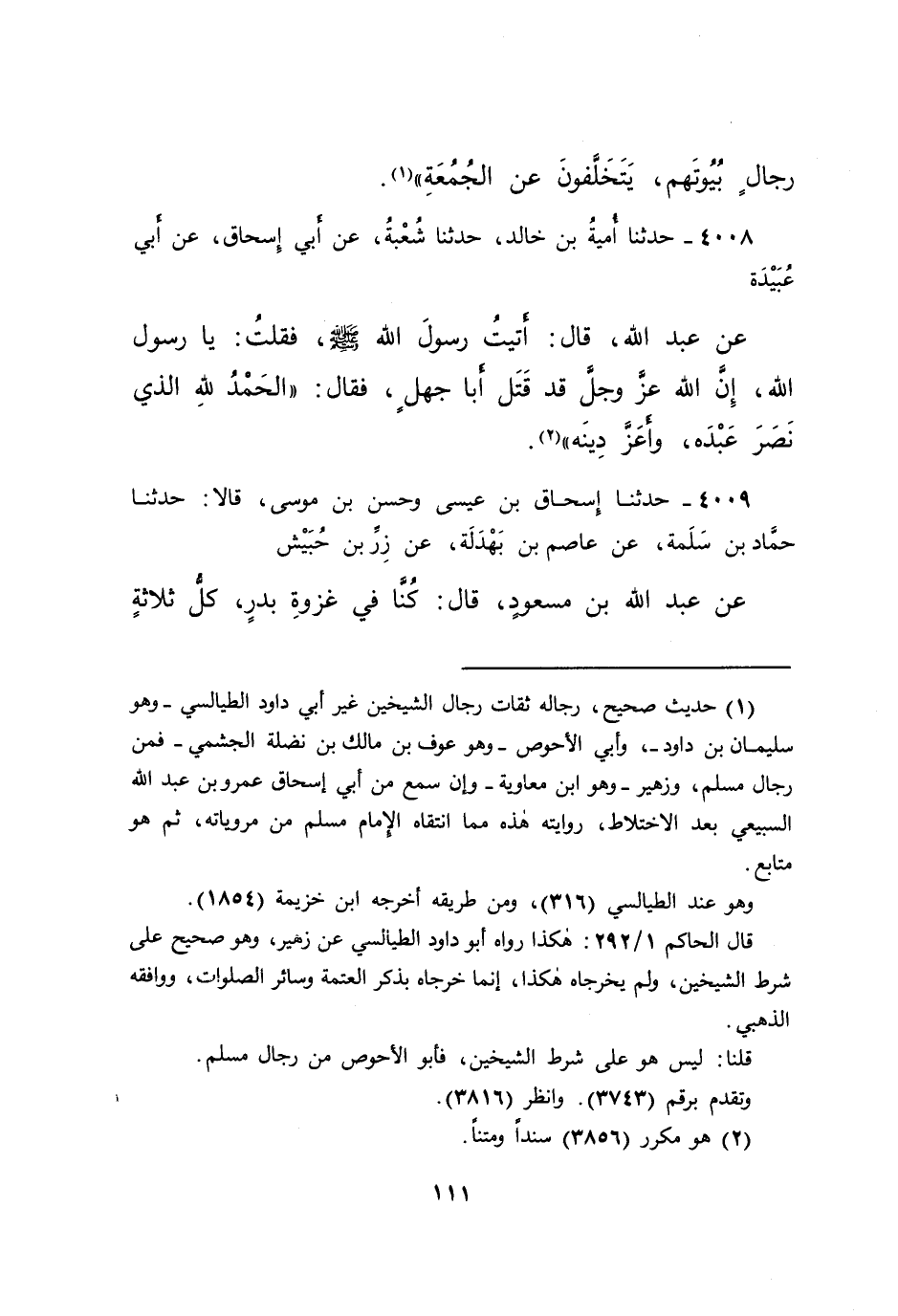 ٤٠٠٨ - حَدَّثَنَا أُمَيَّةُ بْنُ خَالِدٍ، حَدَّثَنَا شُعْبَةُ، عَنْ أَبِي إِسْحَاقَ، عَنْ أَبِي عُبَيْدَةَ، عَنْ عَبْدِ اللهِ، قَالَ: أَتَيْتُ رَسُولَ اللهِ صَلَّى اللهُ عَلَيْهِ وَسَلَّمَ، فَقُلْتُ: يَا رَسُولَ اللهِ، إِنَّ اللهَ عَزَّ وَجَلَّ قَدْ قَتَلَ أَبَا جَهْلٍ، فَقَالَ: " الْحَمْدُ لِلَّهِ الَّذِي نَصَرَ عَبْدَهُ، وَأَعَزَّ دِينَهُ " (٢)