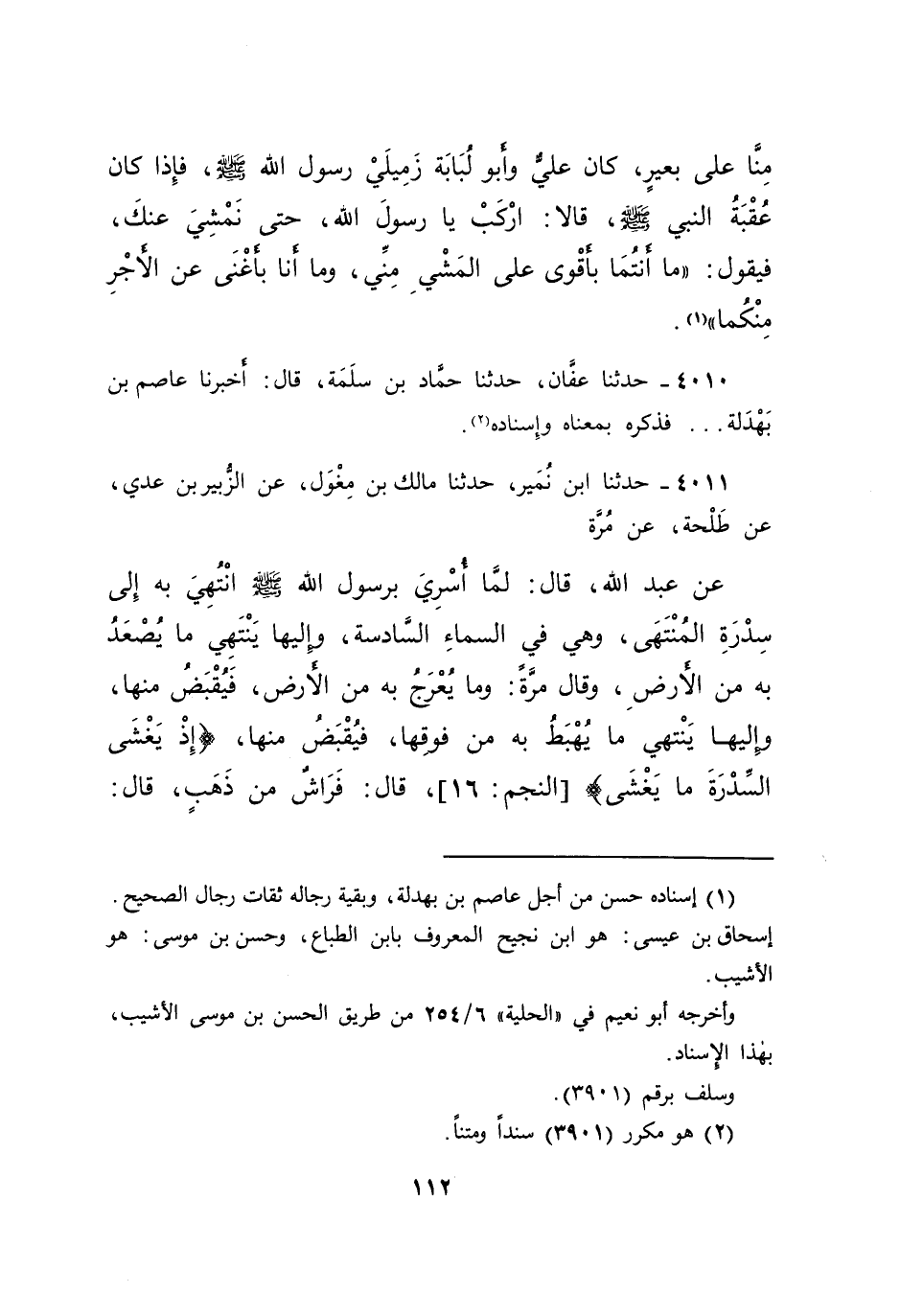 ٤٠١١ - حَدَّثَنَا ابْنُ نُمَيْرٍ، حَدَّثَنَا مَالِكُ بْنُ مِغْوَلٍ، عَنِ الزُّبَيْرِ بْنِ عَدِيٍّ، عَنْ طَلْحَةَ، عَنْ مُرَّةَ، عَنْ عَبْدِ اللهِ، قَالَ: لَمَّا أُسْرِيَ بِرَسُولِ اللهِ صَلَّى اللهُ عَلَيْهِ وَسَلَّمَ انْتُهِيَ بِهِ إِلَى سِدْرَةِ الْمُنْتَهَى، وَهِيَ فِي السَّمَاءِ السَّادِسَةِ، وَإِلَيْهَا يَنْتَهِي مَا يُصْعَدُ بِهِ مِنَ الْأَرْضِ - وَقَالَ مَرَّةً: وَمَا يُعْرَجُ بِهِ مِنَ الْأَرْضِ - فَيُقْبَضُ مِنْهَا، وَإِلَيْهَا يَنْتَهِي مَا يُهْبَطُ بِهِ مِنْ فَوْقِهَا، فَيُقْبَضُ مِنْهَا، {إِذْ يَغْشَى} [النجم: ١٦] السِّدْرَةَ مَا يَغْشَى، قَالَ: فَرَاشٌ مِنْ ذَهَبٍ، قَالَ: "
