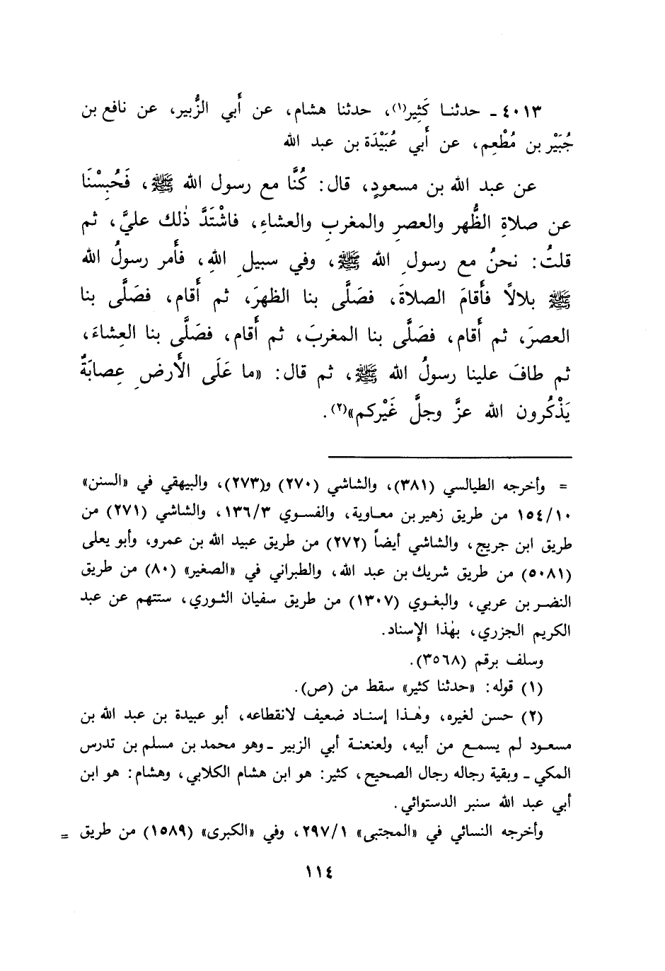 ٤٠١٣ - حَدَّثَنَا كَثِيرٌ (١) ، حَدَّثَنَا هِشَامٌ، عَنْ أَبِي الزُّبَيْرِ، عَنْ نَافِعِ بْنِ جُبَيْرِ بْنِ مُطْعِمٍ، عَنْ أَبِي عُبَيْدَةَ بْنِ عَبْدِ اللهِ، عَنْ عَبْدِ اللهِ بْنِ مَسْعُودٍ، قَالَ: كُنَّا مَعَ رَسُولِ اللهِ صَلَّى اللهُ عَلَيْهِ وَسَلَّمَ، فَحُبِسْنَا عَنْ صَلَاةِ الظُّهْرِ وَالْعَصْرِ وَالْمَغْرِبِ وَالْعِشَاءِ، فَاشْتَدَّ ذَلِكَ عَلَيَّ، ثُمَّ قُلْتُ: نَحْنُ مَعَ رَسُولِ اللهِ صَلَّى اللهُ عَلَيْهِ وَسَلَّمَ، وَفِي سَبِيلِ اللهِ، فَأَمَرَ رَسُولُ اللهِ صَلَّى اللهُ عَلَيْهِ وَسَلَّمَ بِلَالًا فَأَقَامَ الصَّلَاةَ، فَصَلَّى بِنَا الظُّهْرَ، ثُمَّ أَقَامَ، فَصَلَّى بِنَا الْعَصْرَ، ثُمَّ أَقَامَ، فَصَلَّى بِنَا الْمَغْرِبَ، ثُمَّ أَقَامَ، فَصَلَّى بِنَا الْعِشَاءَ، ثُمَّ طَافَ عَلَيْنَا رَسُولُ اللهِ صَلَّى اللهُ عَلَيْهِ وَسَلَّمَ، ثُمَّ قَالَ: " مَا عَلَى الْأَرْضِ عِصَابَةٌ يَذْكُرُونَ اللهَ عَزَّ وَجَلَّ غَيْرُكُمْ " (٢)