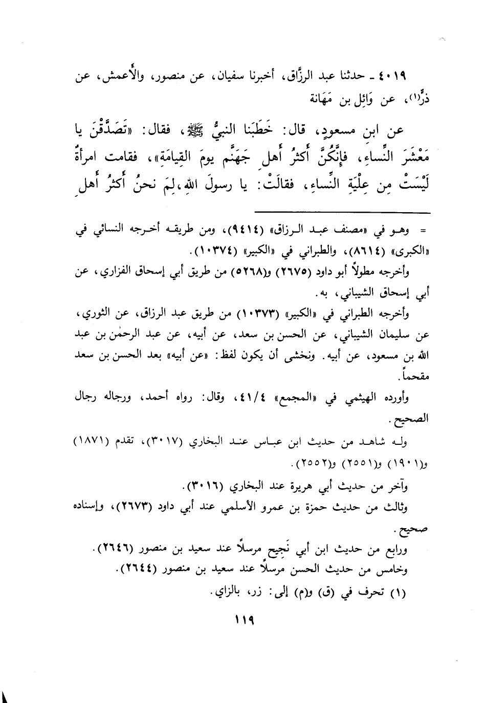 ٤٠١٩ - حَدَّثَنَا عَبْدُ الرَّزَّاقِ، أَخْبَرَنَا سُفْيَانُ، عَنْ مَنْصُورٍ، وَالْأَعْمَشِ، عَنْ ذَرٍّ (١) ، عَنْ وَائِلِ بْنِ مَهَانَةَ، عَنِ ابْنِ مَسْعُودٍ، قَالَ: خَطَبَنَا النَّبِيُّ صَلَّى اللهُ عَلَيْهِ وَسَلَّمَ، فَقَالَ: " تَصَدَّقْنَ يَا مَعْشَرَ النِّسَاءِ، فَإِنَّكُنَّ أَكْثَرُ أَهْلِ جَهَنَّمَ يَوْمَ الْقِيَامَةِ "، فَقَامَتِ امْرَأَةٌ لَيْسَتْ مِنْ عِلْيَةِ النِّسَاءِ، فَقَالَتْ: يَا رَسُولَ اللهِ، لِمَ نَحْنُ أَكْثَرُ أَهْلِ