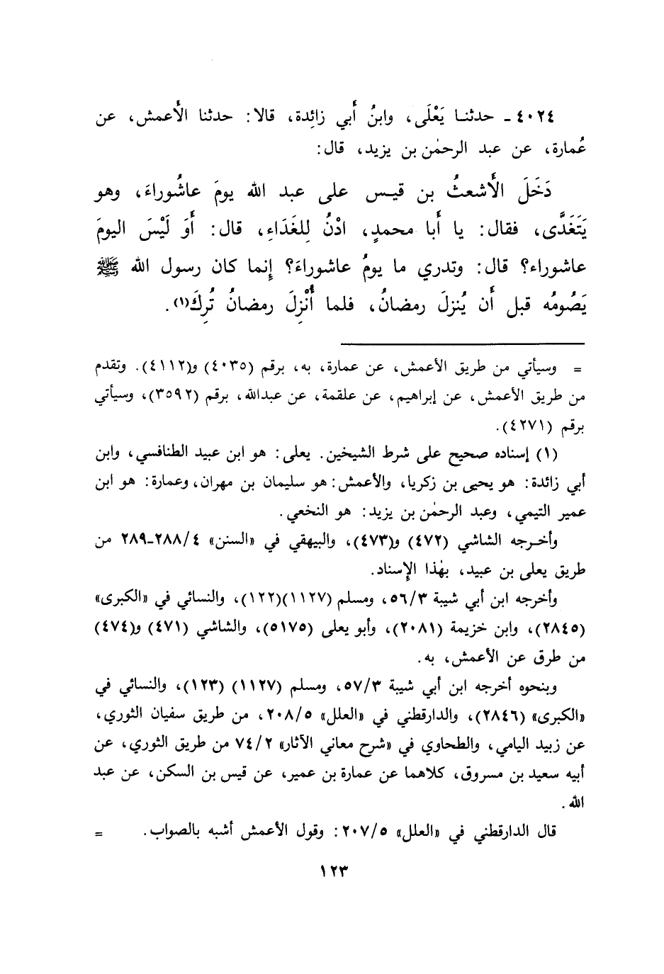 ٤٠٢٤ - حَدَّثَنَا يَعْلَى، وَابْنُ أَبِي زَائِدَةَ، قَالَا: حَدَّثَنَا الْأَعْمَشُ، عَنْ عُمَارَةَ، عَنْ عَبْدِ الرَّحْمَنِ بْنِ يَزِيدَ، قَالَ: دَخَلَ الْأَشْعَثُ بْنُ قَيْسٍ عَلَى عَبْدِ اللهِ، يَوْمَ عَاشُورَاءَ، وَهُوَ يَتَغَدَّى، فَقَالَ: يَا أَبَا مُحَمَّدٍ، ادْنُ لِلْغَدَاءِ، قَالَ: أَوَلَيْسَ الْيَوْمُ عَاشُورَاءَ؟ قَالَ: وَتَدْرِي مَا يَوْمُ عَاشُورَاءَ؟ إِنَّمَا " كَانَ رَسُولُ اللهِ صَلَّى اللهُ عَلَيْهِ وَسَلَّمَ يَصُومُهُ قَبْلَ أَنْ يَنْزِلَ رَمَضَانُ، فَلَمَّا أُنْزِلَ رَمَضَانُ تُرِكَ " (١)