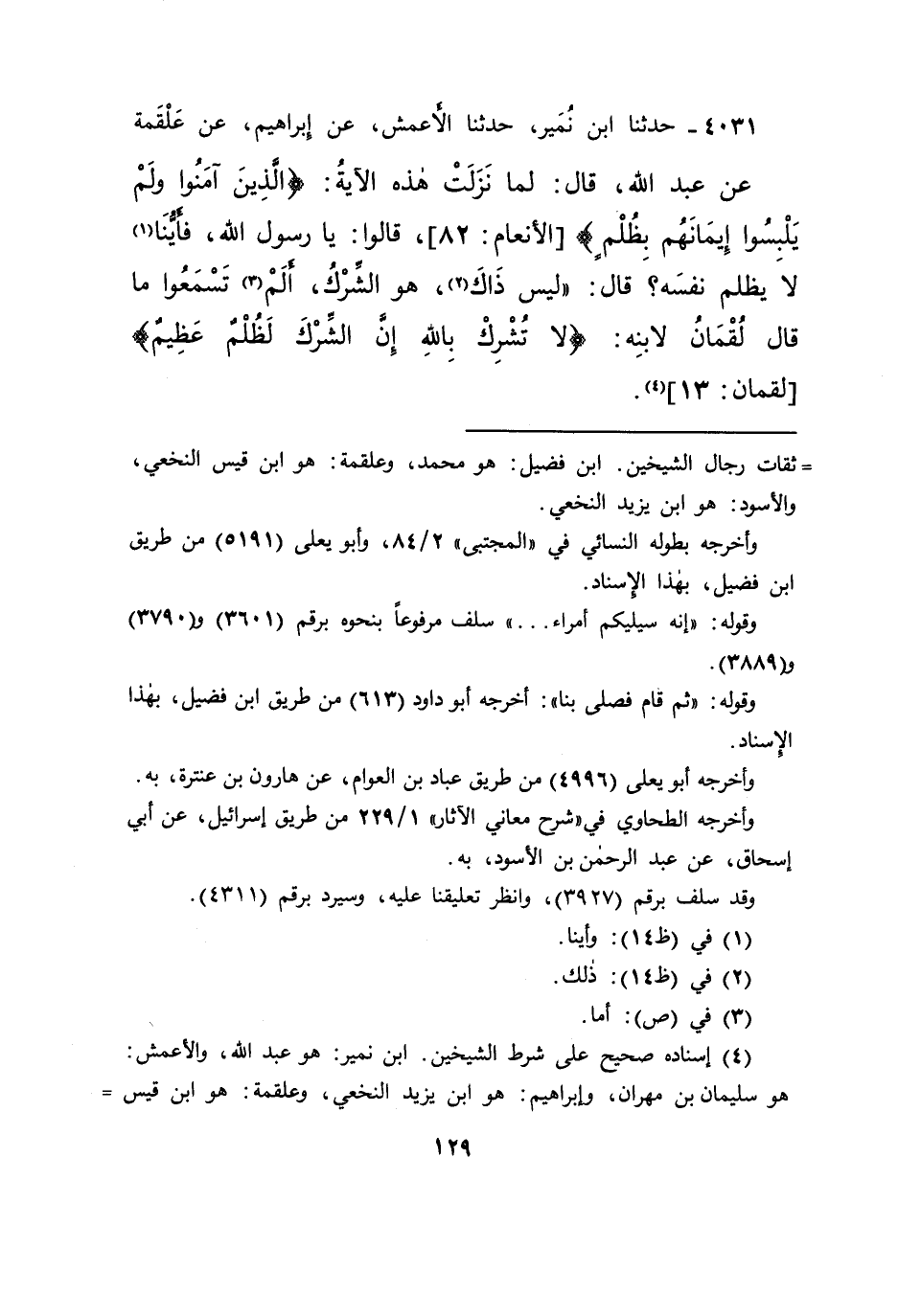 ٤٠٣١ - حَدَّثَنَا ابْنُ نُمَيْرٍ، حَدَّثَنَا الْأَعْمَشُ، عَنْ إِبْرَاهِيمَ، عَنْ عَلْقَمَةَ، عَنْ عَبْدِ اللهِ، قَالَ: لَمَّا نَزَلَتْ هَذِهِ الْآيَةُ: {الَّذِينَ آمَنُوا وَلَمْ يَلْبِسُوا إِيمَانَهُمْ بِظُلْمٍ} [الأنعام: ٨٢] ، قَالُوا: يَا رَسُولَ اللهِ، فَأَيُّنَا (١) لَا يَظْلِمُ نَفْسَهُ؟ قَالَ: " لَيْسَ ذَاكَ، (٢) هُوَ الشِّرْكَ، أَلَمْ (٣) تَسْمَعُوا مَا قَالَ لُقْمَانُ لِابْنِهِ: {لَا تُشْرِكْ بِاللهِ إِنَّ الشِّرْكَ لَظُلْمٌ عَظِيمٌ} [لقمان: ١٣] " (٤)