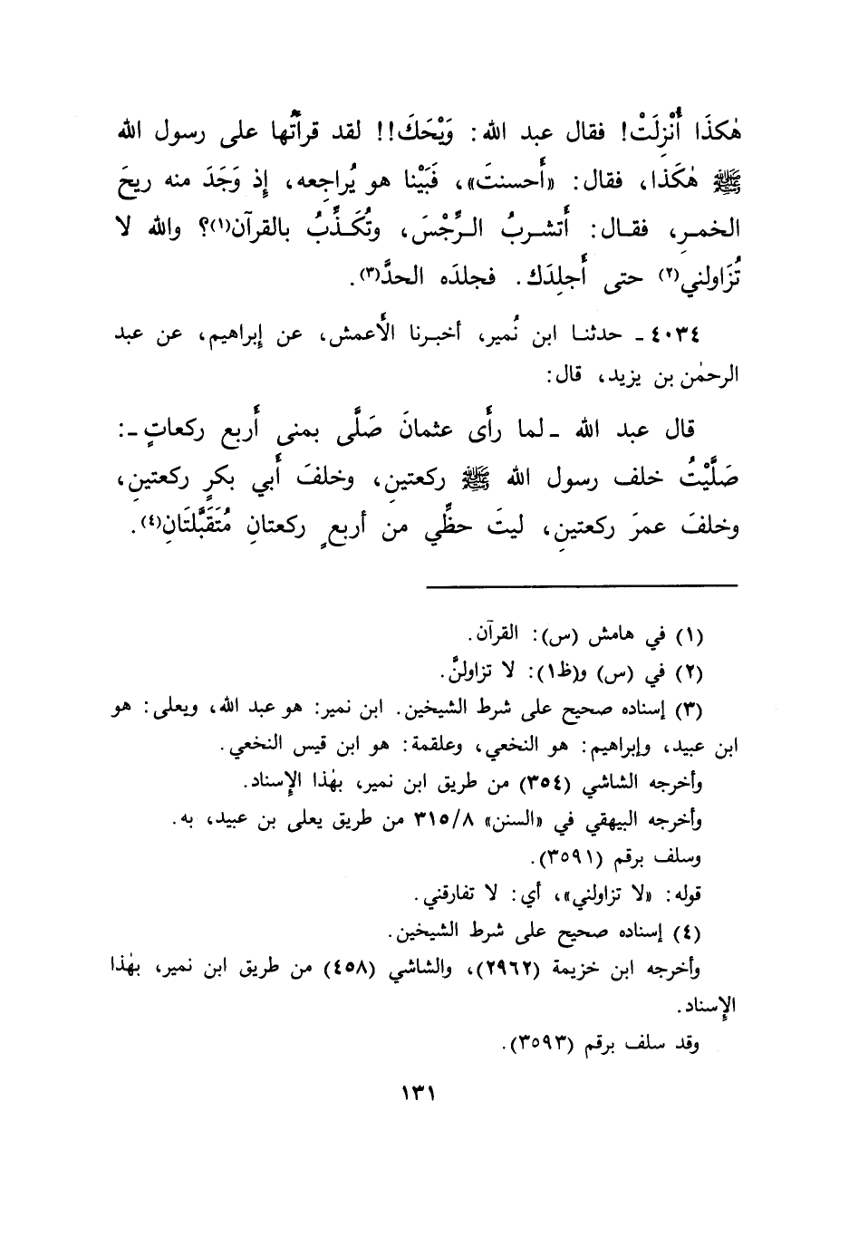 ٤٠٣٤ - حَدَّثَنَا ابْنُ نُمَيْرٍ، أَخْبَرَنَا الْأَعْمَشُ، عَنْ إِبْرَاهِيمَ، عَنْ عَبْدِ الرَّحْمَنِ بْنِ يَزِيدَ، قَالَ: قَالَ عَبْدُ اللهِ، لَمَّا رَأَى عُثْمَانَ صَلَّى بِمِنًى أَرْبَعَ رَكَعَاتٍ: " صَلَّيْتُ خَلْفَ رَسُولِ اللهِ صَلَّى اللهُ عَلَيْهِ وَسَلَّمَ رَكْعَتَيْنِ "، وَخَلْفَ أَبِي بَكْرٍ رَكْعَتَيْنِ، وَخَلْفَ عُمَرَ رَكْعَتَيْنِ، لَيْتَ حَظِّي مِنْ أَرْبَعٍ رَكْعَتَانِ مُتَقَبَّلَتَانِ (٤)