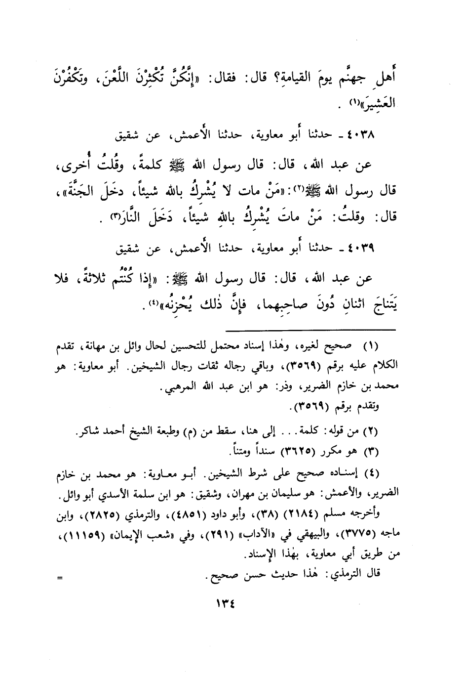 ٤٠٣٨ - حَدَّثَنَا أَبُو مُعَاوِيَةَ، حَدَّثَنَا الْأَعْمَشُ، عَنْ شَقِيقٍ، عَنْ عَبْدِ اللهِ، قَالَ: قَالَ رَسُولُ اللهِ صَلَّى اللهُ عَلَيْهِ وَسَلَّمَ: كَلِمَةً، وَقُلْتُ أُخْرَى، قَالَ رَسُولُ اللهِ صَلَّى اللهُ عَلَيْهِ وَسَلَّمَ: " مَنْ مَاتَ لَا يُشْرِكُ بِاللهِ شَيْئًا، (٢) دَخَلَ الْجَنَّةَ " قَالَ: وَقُلْتُ: " مَنْ مَاتَ يُشْرِكُ بِاللهِ شَيْئًا، دَخَلَ النَّارَ " (٣)