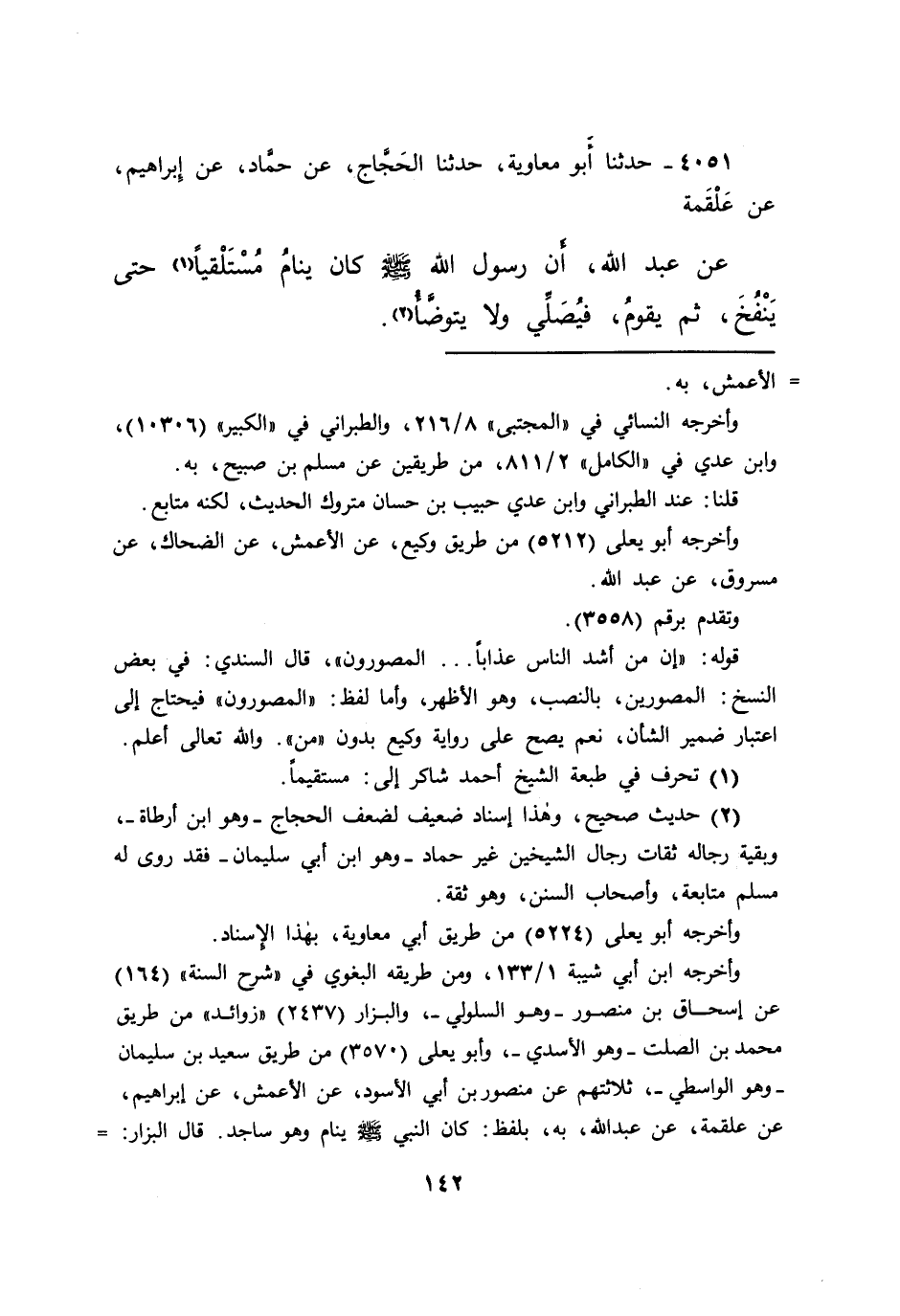 ٤٠٥١ - حَدَّثَنَا أَبُو مُعَاوِيَةَ، حَدَّثَنَا الْحَجَّاجُ، عَنْ حَمَّادٍ، عَنْ إِبْرَاهِيمَ، عَنْ عَلْقَمَةَ، عَنْ عَبْدِ اللهِ، أَنَّ رَسُولَ اللهِ صَلَّى اللهُ عَلَيْهِ وَسَلَّمَ " كَانَ يَنَامُ مُسْتَلْقِيًا (١) حَتَّى يَنْفُخَ، ثُمَّ يَقُومُ، فَيُصَلِّي وَلَا يَتَوَضَّأُ " (٢)