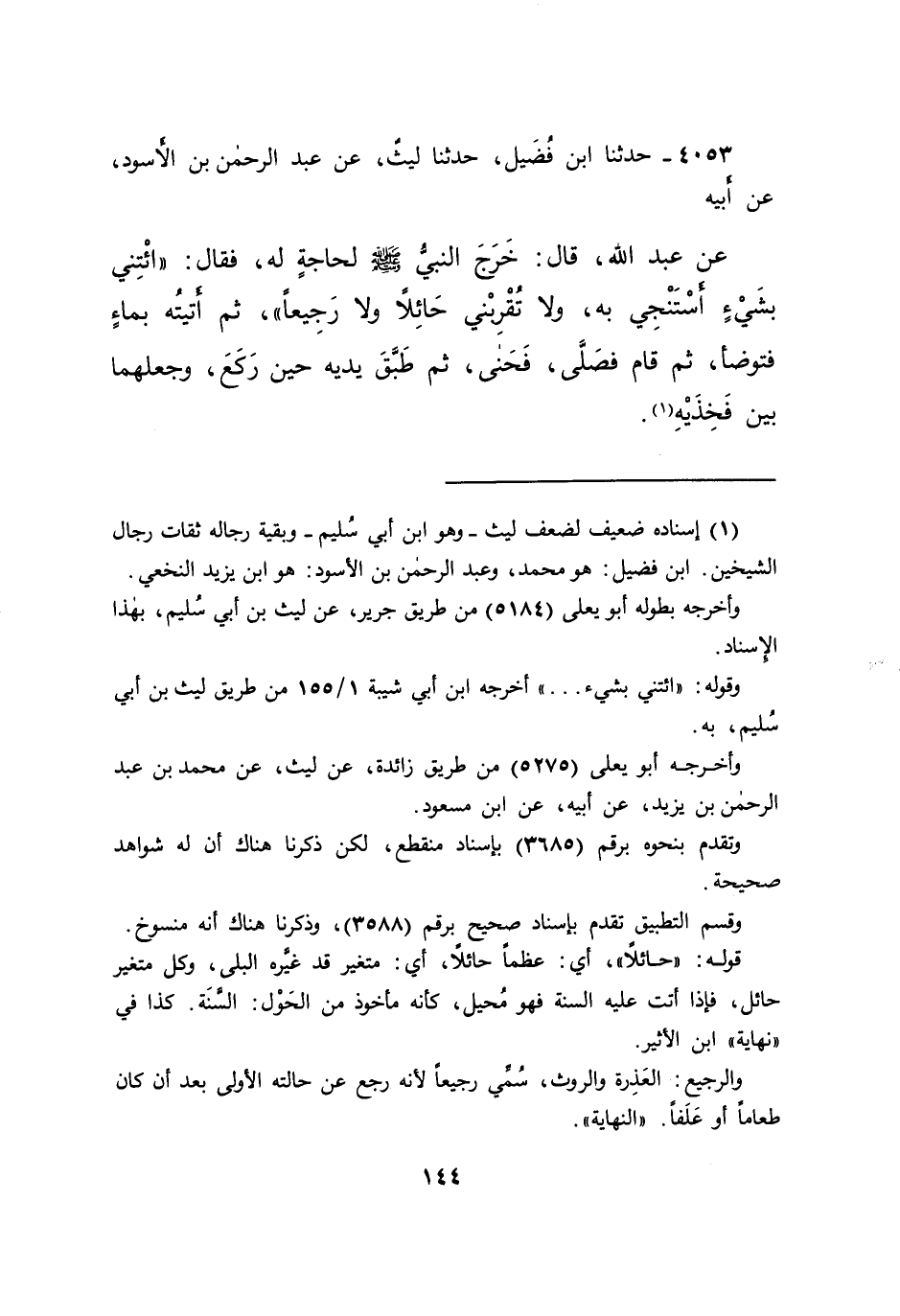 ٤٠٥٣ - حَدَّثَنَا ابْنُ فُضَيْلٍ، حَدَّثَنَا لَيْثٌ، عَنْ عَبْدِ الرَّحْمَنِ بْنِ الْأَسْوَدِ، عَنْ أَبِيهِ، عَنْ عَبْدِ اللهِ، قَالَ: خَرَجَ النَّبِيُّ صَلَّى اللهُ عَلَيْهِ وَسَلَّمَ لِحَاجَةٍ لَهُ، فَقَالَ: " ائْتِنِي بِشَيْءٍ أَسْتَنْجِي بِهِ، وَلَا تُقْرِبْنِي حَائِلًا، وَلَا رَجِيعًا "، ثُمَّ أَتَيْتُهُ بِمَاءٍ، فَتَوَضَّأَ، ثُمَّ قَامَ فَصَلَّى، فَحَنَي، ثُمَّ طَبَّقَ يَدَيْهِ حِينَ رَكَعَ، وَجَعَلَهُمَا بَيْنَ فَخِذَيْهِ
