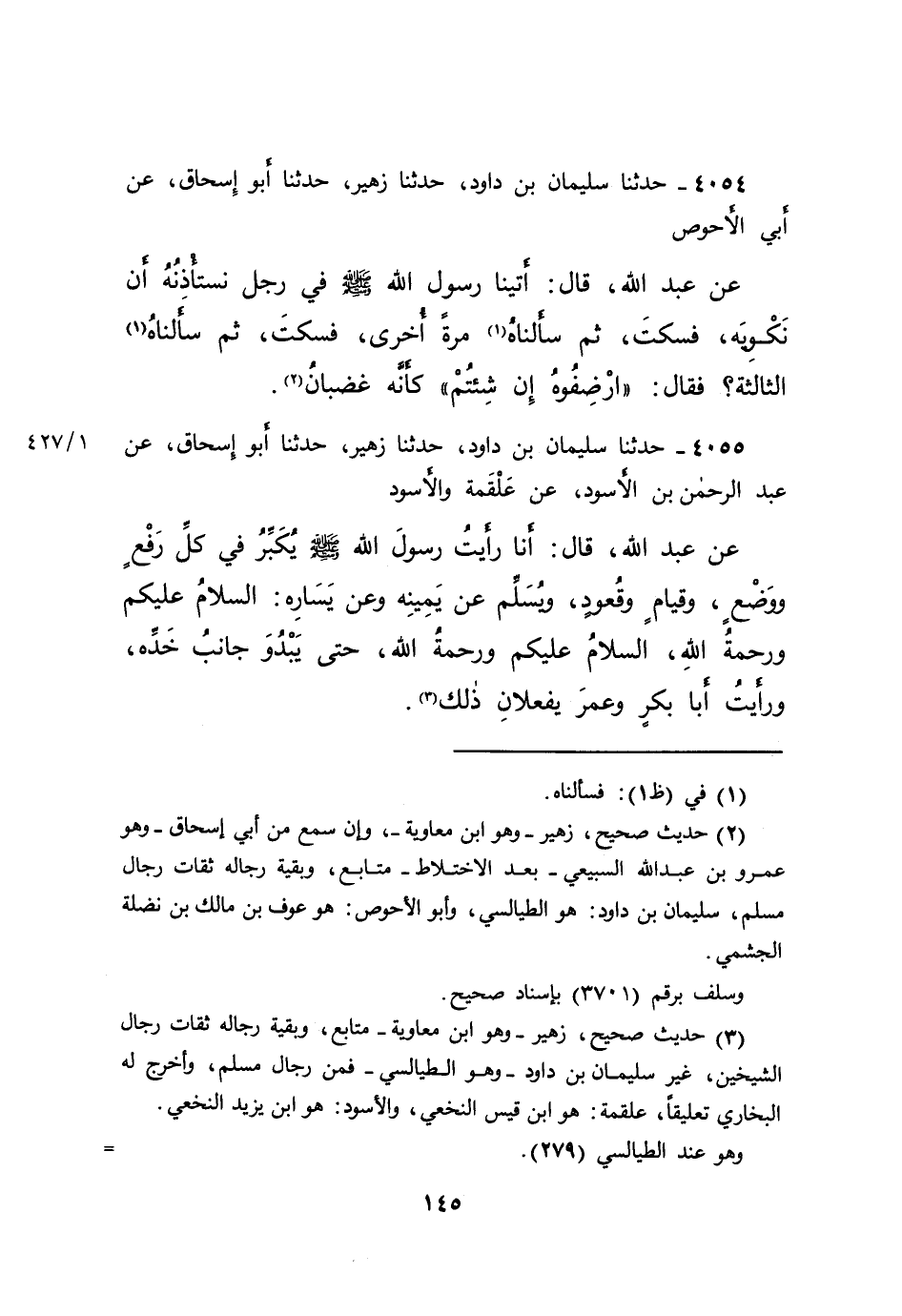 (٣) حديث صحيح، زهير- وهو ابن معاوية - متابع، وبقية رجاله ثقات رجال الشيخين، غير سليمان بن داود - وهو الطيالسي - فمن رجال مسلم، وأخرج له البخاري تعليقاً، علقمة: هو ابن قيس النخعي، والأسود: هو ابن يزيد النخعي.
