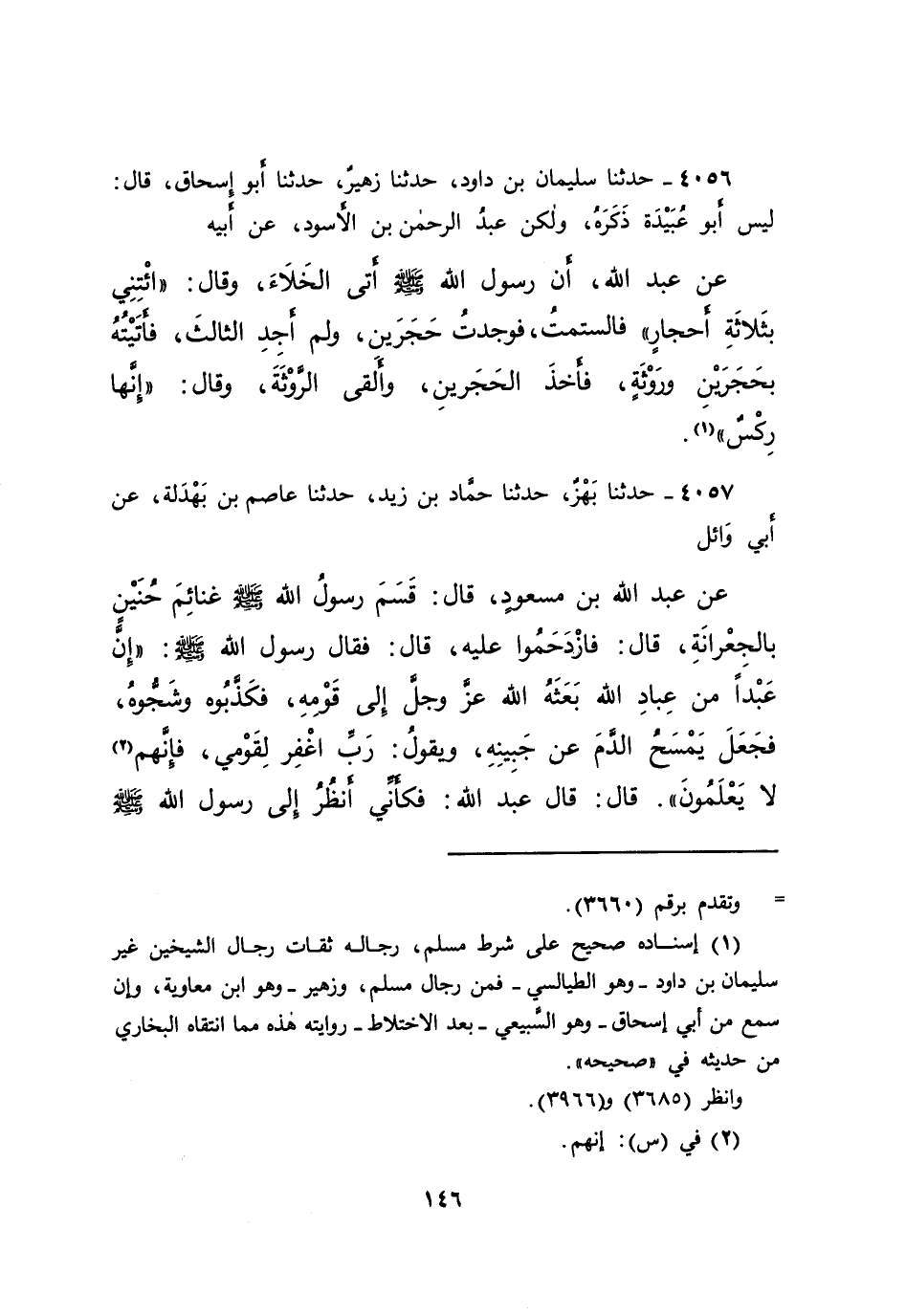 ٤٠٥٦ - حَدَّثَنَا سُلَيْمَانُ بْنُ دَاوُدَ، حَدَّثَنَا زُهَيْرٌ، حَدَّثَنَا أَبُو إِسْحَاقَ، قَالَ: لَيْسَ أَبُو عُبَيْدَةَ ذَكَرَهُ، وَلَكِنْ عَبْدُ الرَّحْمَنِ بْنُ الْأَسْوَدِ، عَنْ أَبِيهِ، عَنْ عَبْدِ اللهِ، أَنَّ رَسُولَ اللهِ صَلَّى اللهُ عَلَيْهِ وَسَلَّمَ أَتَى الْخَلَاءَ، وَقَالَ: " ائْتِنِي بِثَلَاثَةِ أَحْجَارٍ " فَالْتَمَسْتُ، فَوَجَدْتُ حَجَرَيْنِ، وَلَمْ أَجِدِ الثَّالِثَ، فَأَتَيْتُهُ بِحَجَرَيْنِ وَرَوْثَةٍ، فَأَخَذَ الْحَجَرَيْنِ، وَأَلْقَى الرَّوْثَةَ، وَقَالَ: " إِنَّهَا رِكْسٌ " (١)