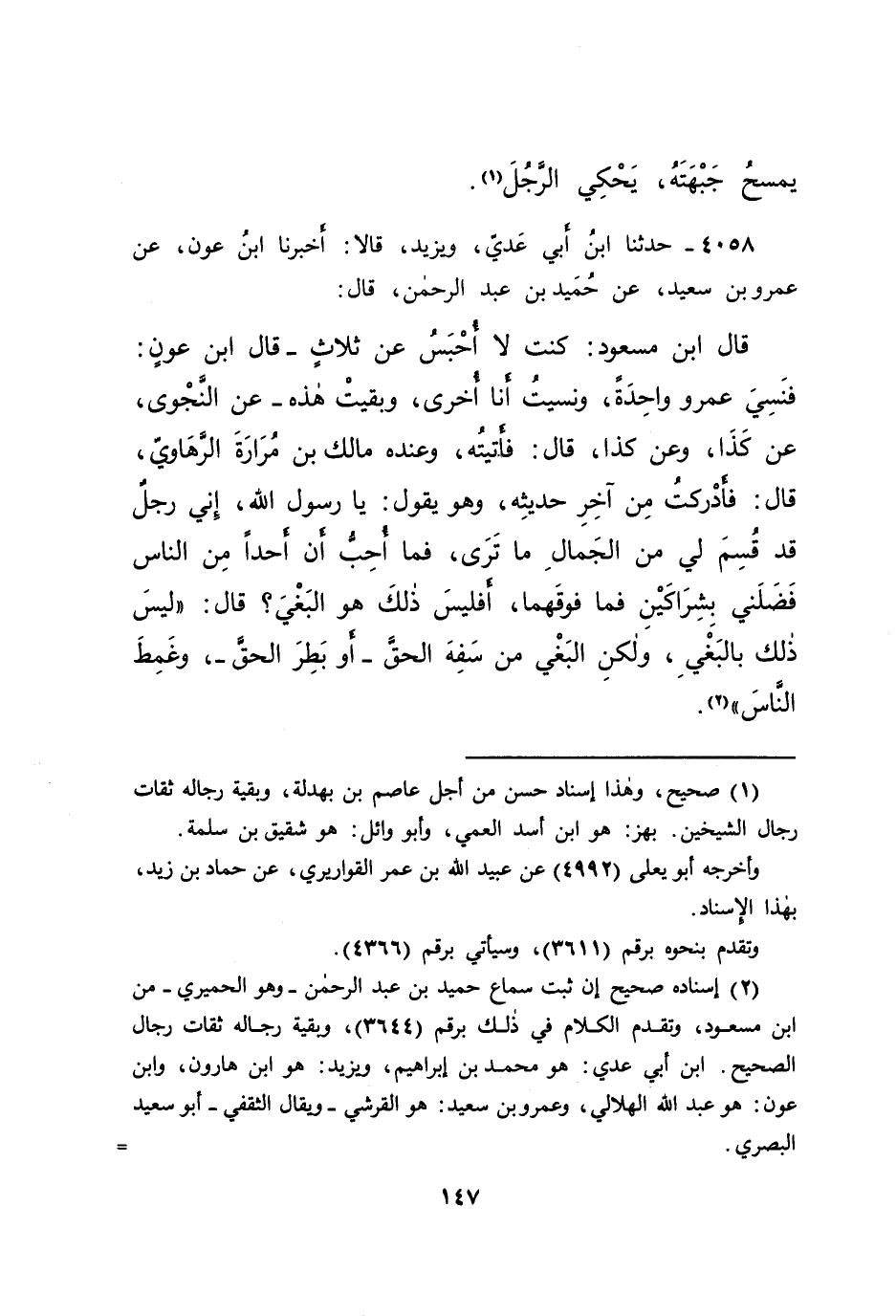 ٤٠٥٨ - حَدَّثَنَا ابْنُ أَبِي عَدِيٍّ، وَيَزِيدُ، قَالَا: أَخْبَرَنَا ابْنُ عَوْنٍ، عَنْ عَمْرِو بْنِ سَعِيدٍ، عَنْ حُمَيْدِ بْنِ عَبْدِ الرَّحْمَنِ، قَالَ: قَالَ ابْنُ مَسْعُودٍ: كُنْتُ لَا أُحْبَسُ عَنْ ثَلَاثٍ - وَقَالَ ابْنُ عَوْنٍ: فَنَسِيَ عَمْرٌو وَاحِدَةً، وَنَسِيتُ أَنَا أُخْرَى، وَبَقِيَتْ هَذِهِ - عَنِ النَّجْوَى، عَنْ كَذَا، وَعَنْ كَذَا، قَالَ: فَأَتَيْتُهُ، وَعِنْدَهُ مَالِكُ بْنُ مُرَارَةَ الرَّهَاوِيُّ، قَالَ: فَأَدْرَكْتُ مِنْ آخِرِ حَدِيثِهِ، وَهُوَ يَقُولُ: يَا رَسُولَ اللهِ، إِنِّي رَجُلٌ قَدْ قُسِمَ لِي مِنَ الْجَمَالِ مَا تَرَى، فَمَا أُحِبُّ أَنَّ أَحَدًا مِنَ النَّاسِ فَضَلَنِي بِشِرَاكَيْنِ، فَمَا فَوْقَهُمَا، أَفَلَيْسَ ذَلِكَ هُوَ الْبَغْيَ؟ قَالَ: " لَيْسَ ذَلِكَ بِالْبَغْيِ، وَلَكِنَّ الْبَغْيَ مَنْ سَفِهَ الْحَقَّ، أَوْ بَطِرَ الْحَقَّ، وَغَمَطَ النَّاسَ " (٢)