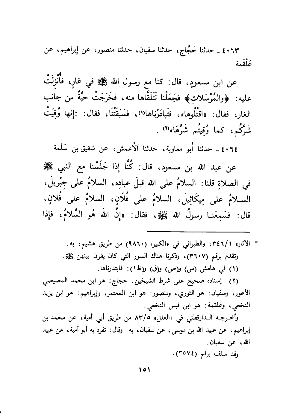 ٤٠٦٣ - حَدَّثَنَا حَجَّاجٌ، حَدَّثَنَا سُفْيَانُ، حَدَّثَنَا مَنْصُورٌ، عَنْ إِبْرَاهِيمَ، عَنْ عَلْقَمَةَ، عَنْ ابْنِ مَسْعُودٍ، قَالَ: كُنَّا مَعَ رَسُولِ اللهِ صَلَّى اللهُ عَلَيْهِ وَسَلَّمَ فِي غَارٍ، فَأُنْزِلَتْ عَلَيْهِ: وَالْمُرْسَلَاتِ عُرْفًا فَجَعَلْنَا نَتَلَقَّاهَا مِنْهُ، فَخَرَجَتْ حَيَّةٌ مِنْ جَانِبِ الْغَارِ، فَقَالَ: " اقْتُلُوهَا "، فَتَبَادَرْنَاهَا (١) ، فَسَبَقَتْنَا، فَقَالَ: " إِنَّهَا وُقِيَتْ شَرَّكُمْ، كَمَا وُقِيتُمْ شَرَّهَا " (٢)