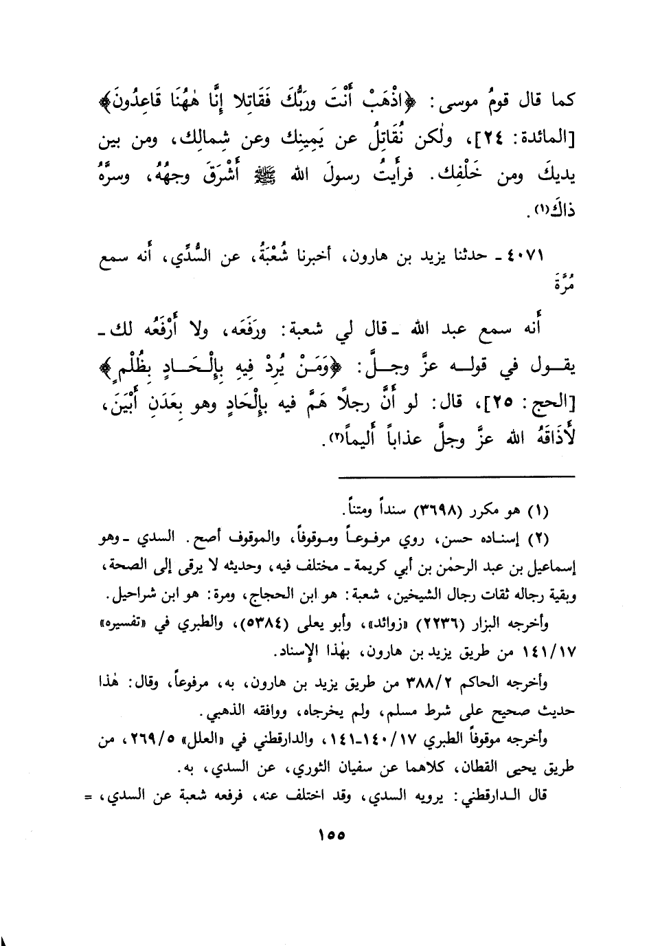 ٤٠٧١ - حَدَّثَنَا يَزِيدُ بْنُ هَارُونَ، أَخْبَرَنَا شُعْبَةُ، عَنْ السُّدِّيِّ، أَنَّهُ سَمِعَ مُرَّةَ، أَنَّهُ سَمِعَ عَبْدَ اللهِ - قَالَ لِي شُعْبَةُ: وَرَفَعَهُ، وَلَا أَرْفَعُهُ لَكَ - يَقُولُ فِي قَوْلِهِ عَزَّ وَجَلَّ: {وَمَنْ يُرِدْ فِيهِ بِإِلْحَادٍ بِظُلْمٍ} [الحج: ٢٥] ، قَالَ: " لَوْ أَنَّ رَجُلًا هَمَّ فِيهِ بِإِلْحَادٍ وَهُوَ بِعَدَنِ أَبْيَنَ، لَأَذَاقَهُ اللهُ عَزَّ وَجَلَّ عَذَابًا أَلِيمًا " (٢)