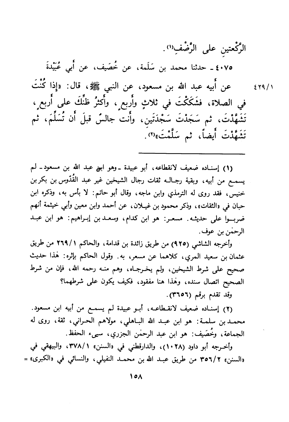 ٤٠٧٥ - حَدَّثَنَا مُحَمَّدُ بْنُ سَلَمَةَ، عَنْ خُصَيْفٍ، عَنْ أَبِي عُبَيْدَةَ، عَنْ أَبِيهِ عَبْدِ اللهِ بْنِ مَسْعُودٍ، عَنِ النَّبِيِّ صَلَّى اللهُ عَلَيْهِ وَسَلَّمَ قَالَ: " إِذَا كُنْتَ فِي الصَّلَاةِ، فَشَكَكْتَ فِي ثَلَاثٍ وَأَرْبَعٍ، وَأَكْثَرُ ظَنِّكَ عَلَى أَرْبَعٍ، تَشَهَّدْتَ، ثُمَّ سَجَدْتَ سَجْدَتَيْنِ، وَأَنْتَ جَالِسٌ قَبْلَ أَنْ تُسَلِّمَ، ثُمَّ تَشَهَّدْتَ أَيْضًا، ثُمَّ سَلَّمْتَ " (٢)
