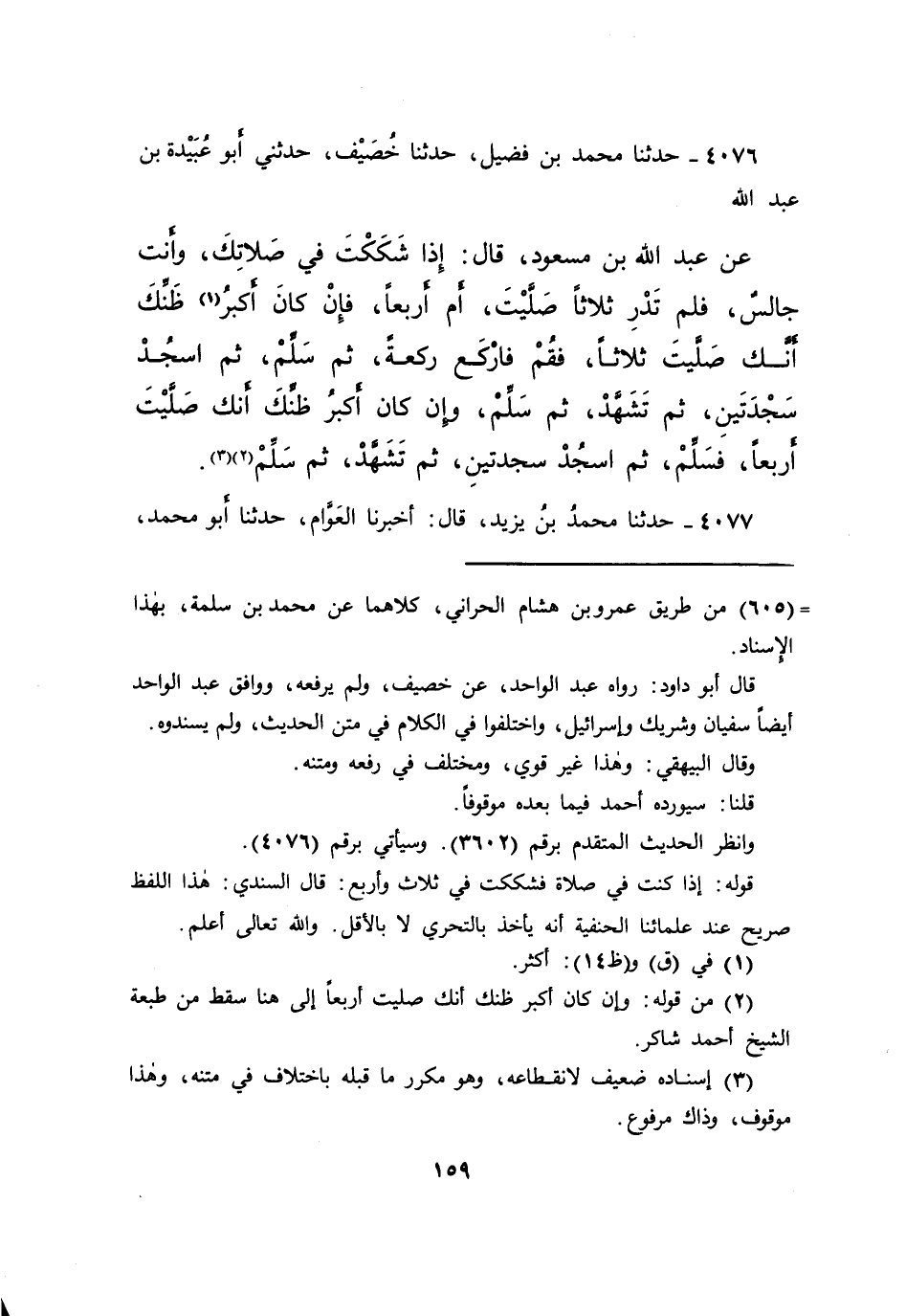 ٤٠٧٦ - حَدَّثَنَا مُحَمَّدُ بْنُ فُضَيْلٍ، حَدَّثَنَا خُصَيْفٌ، حَدَّثَنِي أَبُو عُبَيْدَةَ بْنُ عَبْدِ اللهِ، عَنْ عَبْدِ اللهِ بْنِ مَسْعُودٍ، قَالَ: " إِذَا شَكَكْتَ فِي صَلَاتِكَ، وَأَنْتَ جَالِسٌ، فَلَمْ تَدْرِ ثَلَاثًا صَلَّيْتَ، أَمْ أَرْبَعًا، فَإِنْ كَانَ أَكْبَرُ (١) ظَنِّكَ أَنَّكَ صَلَّيْتَ ثَلَاثًا، فَقُمْ فَارْكَعْ رَكْعَةً، ثُمَّ سَلِّمْ، ثُمَّ اسْجُدْ سَجْدَتَيْنِ، ثُمَّ تَشَهَّدْ، ثُمَّ سَلِّمْ، وَإِنْ كَانَ أَكْبَرُ ظَنِّكَ أَنَّكَ صَلَّيْتَ أَرْبَعًا، فَسَلِّمْ، ثُمَّ اسْجُدْ سَجْدَتَيْنِ، ثُمَّ تَشَهَّدْ، ثُمَّ سَلِّمْ " (٢) (٣)