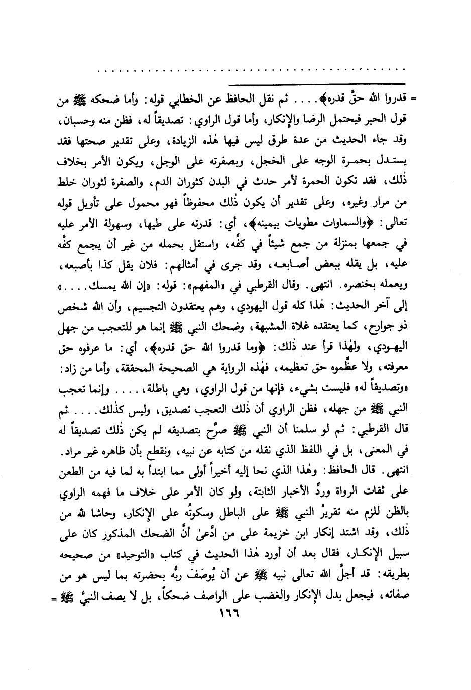 = قدروا الله حق قدره} .... ثم نقل الحافظ عن الخطابي قوله: وأما ضحكه صَلَّى اللهُ عَلَيْهِ وَسَلَّمَ من قول الحبر فيحتمل الرضا والإنكار، وأما قول الراوي: تصديقاً له، فظن منه وحسبان، وقد جاء الحديث من عدة طرق ليس فيها هذه الزيادة، وعلى تقدير صحتها فقد يستدل بحمرة الوجه على الخجل، وبصفرته على الوجل، ويكون الأمر بخلاف ذلك، فقد تكون الحمرة لأمر حدث في البدن كثوران الدم، والصفرة لثوران خلط من مرار وغيره، وعلى تقدير أن يكون ذلك محفوظاً فهو محمول على تأويل قوله تعالى: {والسماوات مطويات بيمينه} ، أي: قدرته على طيها، وسهولة الأمر عليه في جمعها بمنزلة من جمع شيئاً في كفه، واستقل بحمله من غير أن يجمع كفه عليه، بل يقله ببعض أصابعه، وقد جرى في أمثالهم: فلان يقل كذا بأصبعه، ويعمله بخنصره ٠ انتهى. وقال القرطبي في "المفهم ": قوله: "إن الله يمسك.... " إلى آخر الحديث: هذا كله قول اليهودي، وهم يعتقدون التجسيم، وأن الله شخص ذو جوارح، كما يعتقده غلاة المشبهة، وضحك النبي صَلَّى اللهُ عَلَيْهِ وَسَلَّمَ إنما هو للتعجب من جهل اليهودي، ولهذا قرأ عند ذلك: {وما قدروا الله حق قدره} ، أي: ما عرفوه حق معرفته، ولا عظْموه حق تعظيمه، فهذه الرواية هي الصحيحة المحققة، وأما من زاد: "وتصديقاً له " فليست بشيء، فإنها من قول الراوي، وهي باطلة،.... وإنما تعجب النبي صَلَّى اللهُ عَلَيْهِ وَسَلَّمَ من جهله، فظن الراوي أن ذلك التعجب تصديق، ولشى كذلك.... ثم قال القرطبي: ثم لو سلمنا أن النبي صَلَّى اللهُ عَلَيْهِ وَسَلَّمَ صزح بتصديقه لم يكن ذلك تصديقاً له في المعنى، بل في اللفظ الذي نقله من كتابه عن نبيه، ونقطع بأن ظاهره غير مراد.