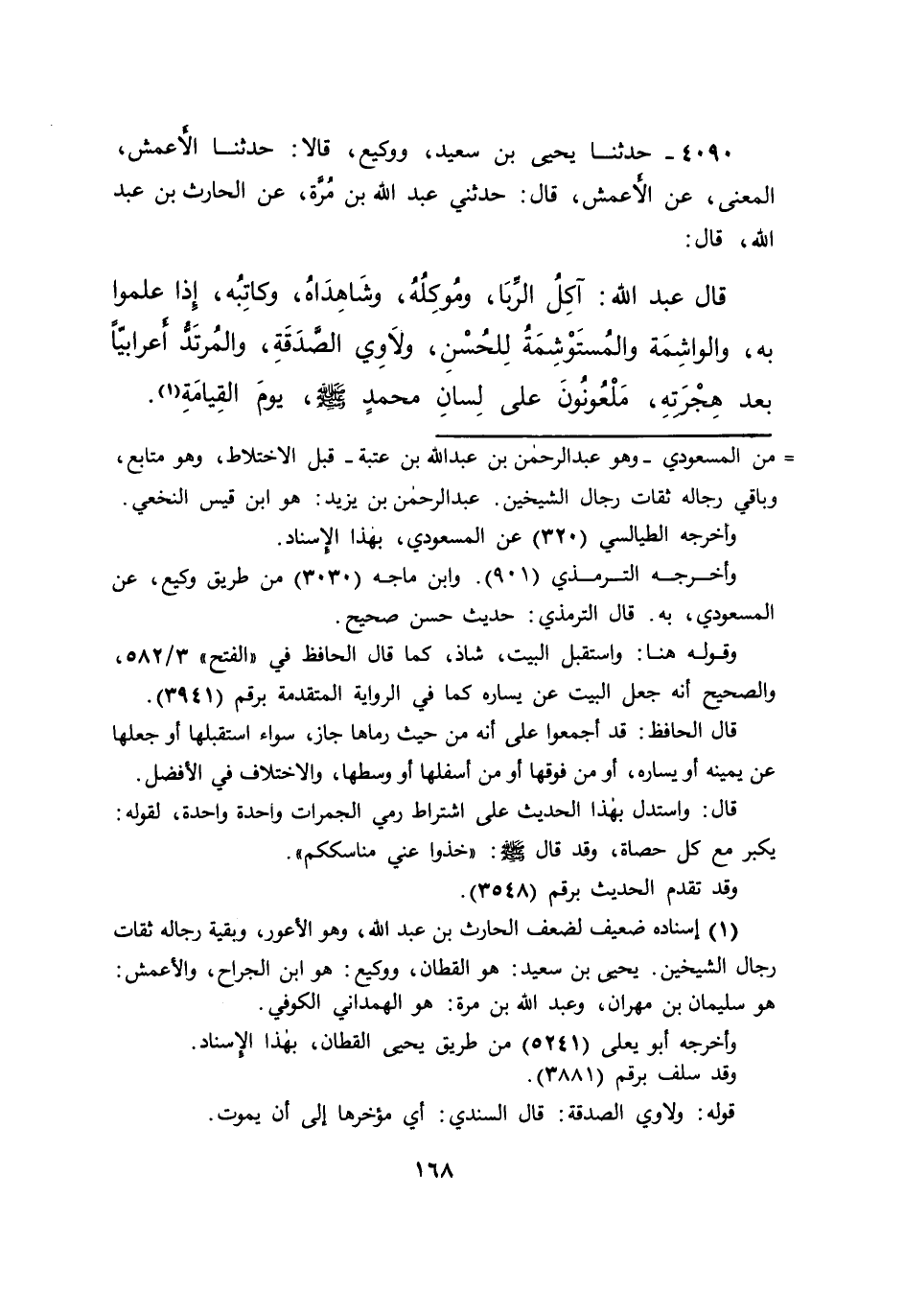 ٤٠٩٠ - حَدَّثَنَا يَحْيَى بْنُ سَعِيدٍ، وَوَكِيعٌ، قَالَا: حَدَّثَنَا الْأَعْمَشُ، الْمَعْنَى، عَنْ الْأَعْمَشِ، قَالَ: حَدَّثَنِي عَبْدُ اللهِ بْنُ مُرَّةَ، عَنِ الْحَارِثِ بْنِ عَبْدِ اللهِ، قَالَ: قَالَ عَبْدُ اللهِ: " آكِلُ الرِّبَا، وَمُوكِلُهُ، وَشَاهِدَاهُ، وَكَاتِبُهُ، إِذَا عَلِمُوا بِهِ، وَالْوَاشِمَةُ، وَالْمُسْتَوْشِمَةُ لِلْحُسْنِ، وَلَاوِي الصَّدَقَةِ، وَالْمُرْتَدُّ أَعْرَابِيًّا بَعْدَ هِجْرَتِهِ، مَلْعُونُونَ عَلَى لِسَانِ مُحَمَّدٍ صَلَّى اللهُ عَلَيْهِ وَسَلَّمَ، يَوْمَ الْقِيَامَةِ " (١)