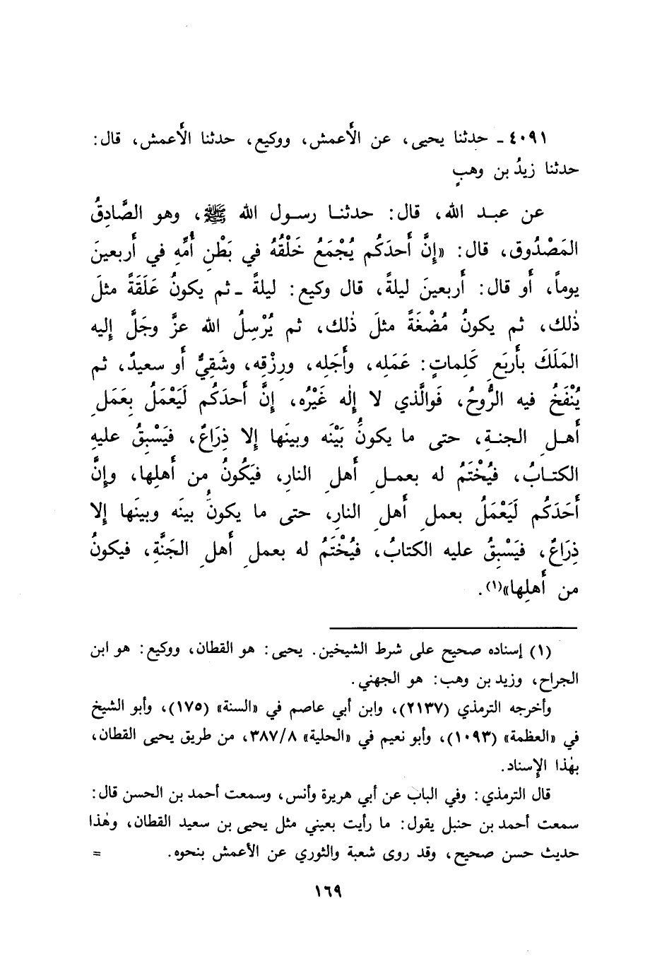 ٤٠٩١ - حَدَّثَنَا يَحْيَى، عَنْ الْأَعْمَشِ، وَوَكِيعٌ، حَدَّثَنَا الْأَعْمَشُ، قَالَ: حَدَّثَنَا زَيْدُ بْنُ وَهْبٍ، عَنْ عَبْدِ اللهِ، قَالَ: حَدَّثَنَا رَسُولُ اللهِ صَلَّى اللهُ عَلَيْهِ وَسَلَّمَ، وَهُوَ الصَّادِقُ الْمَصْدُوقُ، قَالَ: " إِنَّ أَحَدَكُمْ يُجْمَعُ خَلْقُهُ فِي بَطْنِ أُمِّهِ فِي أَرْبَعِينَ يَوْمًا - أَوْ قَالَ: أَرْبَعِينَ لَيْلَةً، قَالَ وَكِيعٌ: لَيْلَةً - ثُمَّ يَكُونُ عَلَقَةً مِثْلَ ذَلِكَ، ثُمَّ يَكُونُ مُضْغَةً مِثْلَ ذَلِكَ، ثُمَّ يُرْسِلُ اللهُ عَزَّ وَجَلَّ إِلَيْهِ الْمَلَكَ بِأَرْبَعِ كَلِمَاتٍ: عَمَلُهُ، وَأَجَلُهُ، وَرِزْقُهُ، وَشَقِيٌّ أَوْ سَعِيدٌ، ثُمَّ يُنْفَخُ فِيهِ الرُّوحُ، فَوَالَّذِي لَا إِلَهَ غَيْرُهُ، إِنَّ أَحَدَكُمْ لَيَعْمَلُ بِعَمَلِ أَهْلِ الْجَنَّةِ، حَتَّى مَا يَكُونُ بَيْنَهُ وَبَيْنَهَا إِلَّا ذِرَاعٌ، فَيَسْبِقُ عَلَيْهِ الْكِتَابُ، فَيُخْتَمُ لَهُ بِعَمَلِ أَهْلِ النَّارِ، فَيَكُونُ مِنْ أَهْلِهَا، وَإِنَّ أَحَدَكُمْ لَيَعْمَلُ بِعَمَلِ أَهْلِ النَّارِ، حَتَّى مَا يَكُونُ بَيْنَهُ وَبَيْنَهَا إِلَّا ذِرَاعٌ، فَيَسْبِقُ عَلَيْهِ الْكِتَابُ، فَيُخْتَمُ لَهُ بِعَمَلِ أَهْلِ الْجَنَّةِ، فَيَكُونُ مِنْ أَهْلِهَا " (١)