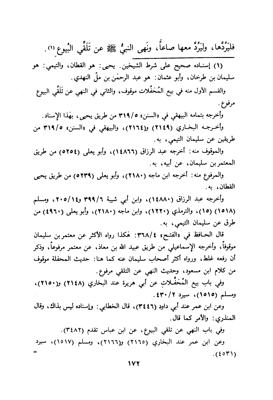 قال الحافظ في "الفتح " ٤/٣٦٨: هكذا رواه الأكثر عن معتمر بن سليمان موقوفاً، وأخرجه الإسماعيلي من طريق عبيد الله بن معاذ، عن معتمر مرفوعاً، وذكر أن رفعه غلط، ورواه أكثر أصحاب سليمان عنه كما هنا: حديث المحفلة موقوف من كلام ابن مسعود، وحديث النهي عن التلقي مرفوع.