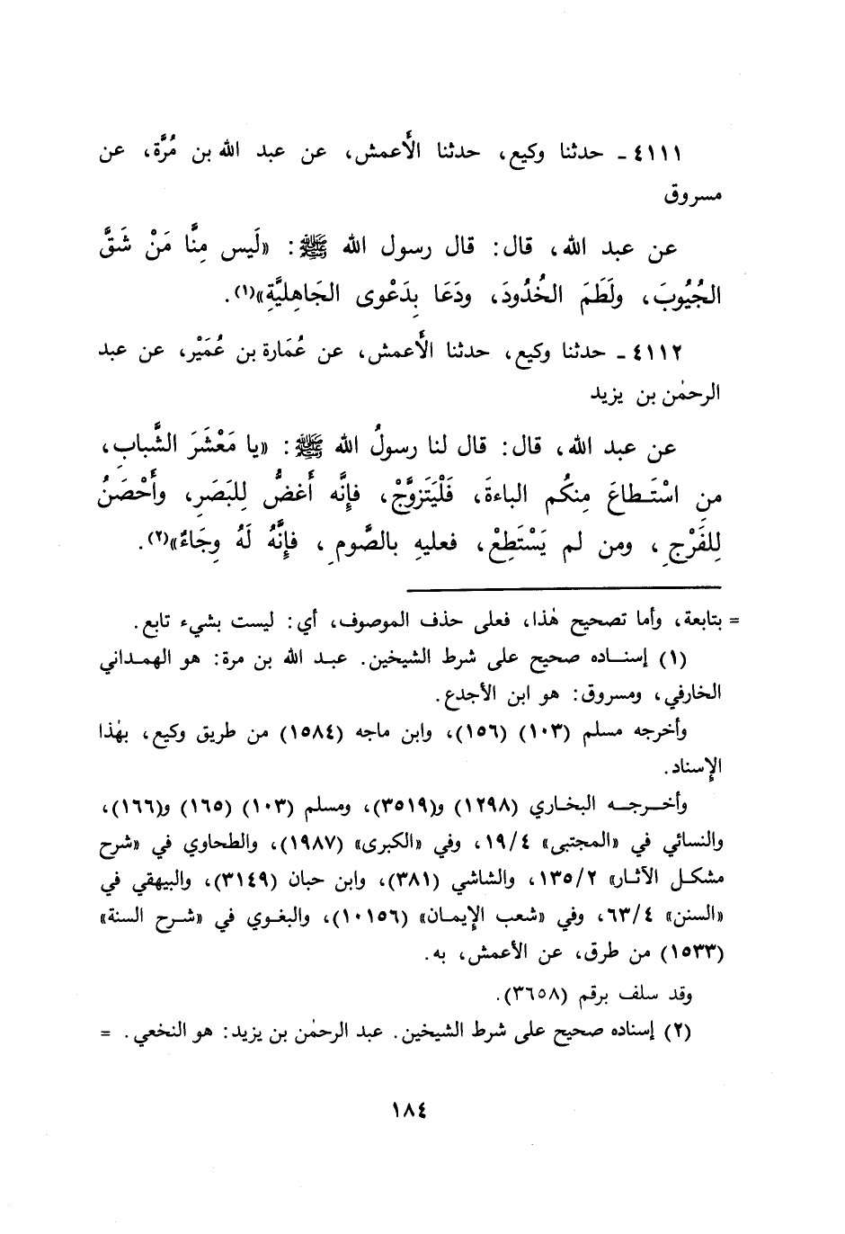 ٤١١٢ - حَدَّثَنَا وَكِيعٌ، حَدَّثَنَا الْأَعْمَشُ، عَنْ عُمَارَةَ بْنِ عُمَيْرٍ، عَنْ عَبْدِ الرَّحْمَنِ بْنِ يَزِيدَ، عَنْ عَبْدِ اللهِ، قَالَ: قَالَ لَنَا رَسُولُ اللهِ صَلَّى اللهُ عَلَيْهِ وَسَلَّمَ: " يَا مَعْشَرَ الشَّبَابِ، مَنِ اسْتَطَاعَ مِنْكُمُ الْبَاءَةَ، فَلْيَتَزَوَّجْ، فَإِنَّهُ أَغَضُّ لِلْبَصَرِ، وَأَحْصَنُ لِلْفَرْجِ، وَمَنْ لَمْ يَسْتَطِعْ، فَعَلَيْهِ بِالصَّوْمِ، فَإِنَّهُ لَهُ وِجَاءٌ " (٢)