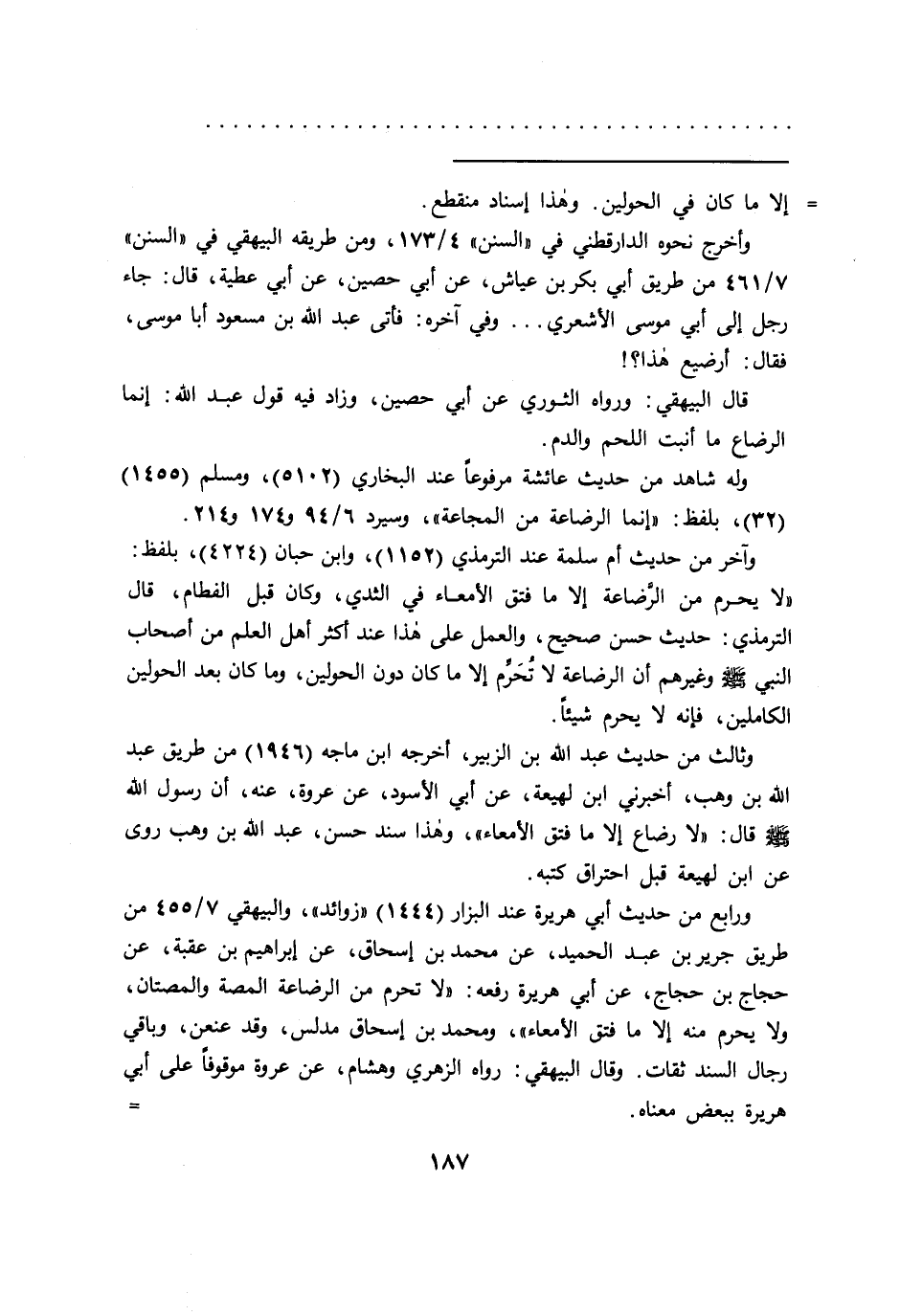 وأخرج نحوه الدارقطني فى "السنن " ٤/١٧٣، ومن طريقه البيهقي في "السنن " ٧/٤٦١ من طريق أبي بكر بن عياش، عن أبي حصين، عن أبي عطية، قال: جاء رجل إلى أبي موسى الأشعري ... وفي آخره: فأتى عبد الله بن مسعود أبا موسى، فقال: أرضيع هذا؟!