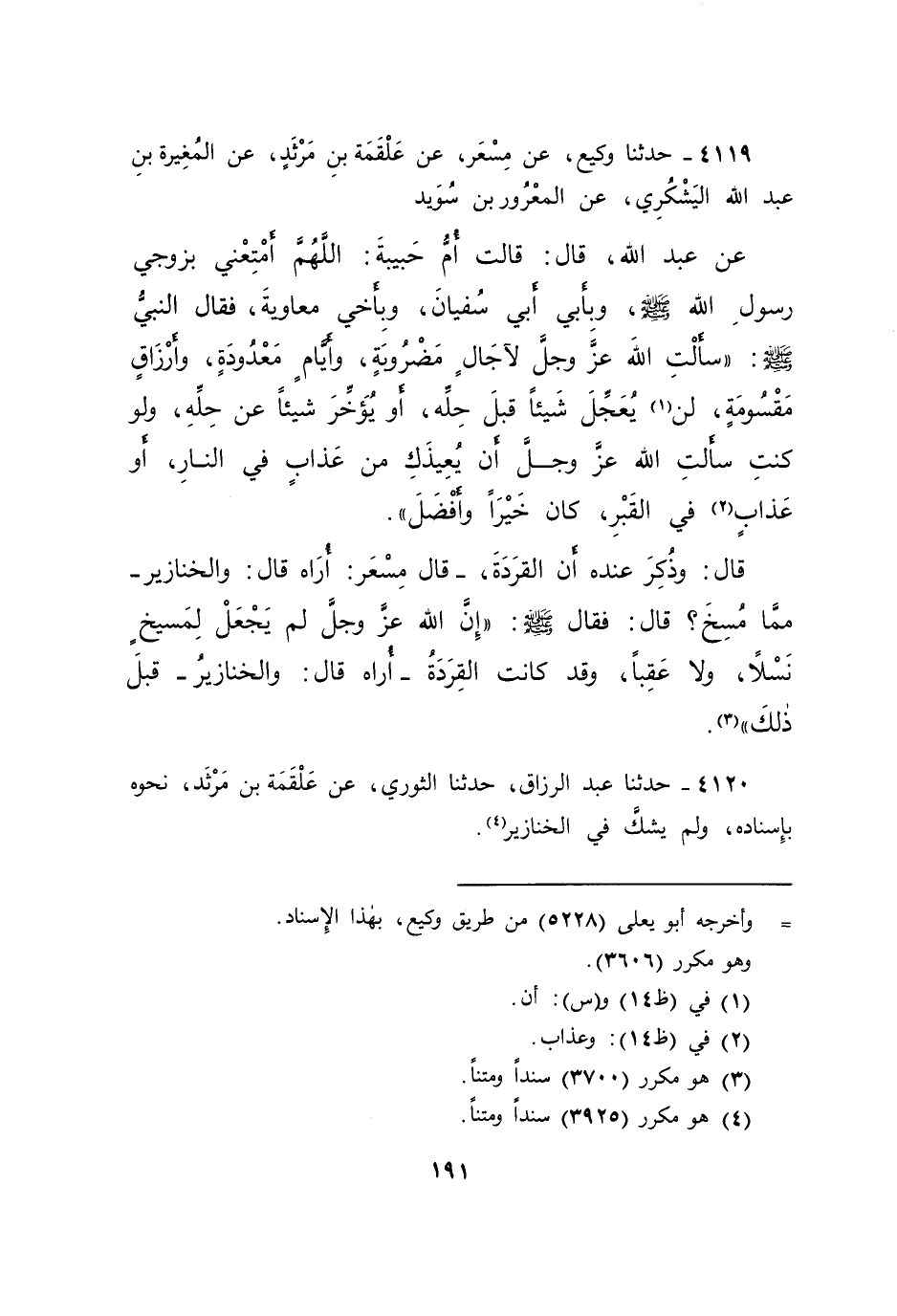 ٤١١٩ - حَدَّثَنَا وَكِيعٌ، عَنْ مِسْعَرٍ، عَنْ عَلْقَمَةَ بْنِ مَرْثَدٍ، عَنْ الْمُغِيرَةِ بْنِ عَبْدِ اللهِ الْيَشْكُرِيِّ، عَنْ الْمَعْرُورِ بْنِ سُوَيْدٍ، عَنْ عَبْدِ اللهِ، قَالَ: قَالَتْ أُمُّ حَبِيبَةَ: اللهُمَّ أَمْتِعْنِي بِزَوْجِي رَسُولِ اللهِ صَلَّى اللهُ عَلَيْهِ وَسَلَّمَ، وَبِأَبِي أَبِي سُفْيَانَ، وَبِأَخِي مُعَاوِيَةَ، فَقَالَ النَّبِيُّ صَلَّى اللهُ عَلَيْهِ وَسَلَّمَ: " سَأَلْتِ اللهَ عَزَّ وَجَلَّ لِآجَالٍ مَضْرُوبَةٍ، وَأَيَّامٍ مَعْدُودَةٍ، وَأَرْزَاقٍ مَقْسُومَةٍ، لَنْ (١) يُعَجِّلَ شَيْئًا قَبْلَ حِلِّهِ، أَوْ يُؤَخِّرَ شَيْئًا عَنْ حِلِّهِ، وَلَوْ كُنْتِ سَأَلْتِ اللهَ عَزَّ وَجَلَّ أَنْ يُعِيذَكِ مِنْ عَذَابٍ (٢) فِي النَّارِ، أَوْ عَذَابٍ فِي الْقَبْرِ، كَانَ خَيْرًا وَأَفْضَلَ "