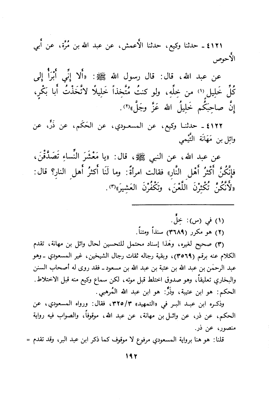 ٤١٢٢ - حَدَّثَنَا وَكِيعٌ، عَنِ الْمَسْعُودِيِّ، عَنْ الْحَكَمِ، عَنْ ذَرٍّ، عَنْ وَائِلِ بْنِ مَهَانَةَ التَّيْمِيِّ، عَنْ عَبْدِ اللهِ، عَنِ النَّبِيِّ صَلَّى اللهُ عَلَيْهِ وَسَلَّمَ قَالَ: " يَا مَعْشَرَ النِّسَاءِ تَصَدَّقْنَ، فَإِنَّكُنَّ أَكْثَرُ أَهْلِ النَّارِ " فَقَالَتِ امْرَأَةٌ: وَمَا لَنَا أَكْثَرُ أَهْلِ النَّارِ؟ قَالَ: " لِأَنَّكُنَّ تُكْثِرْنَ اللَّعْنَ، وَتَكْفُرْنَ الْعَشِيرَ " (٣)