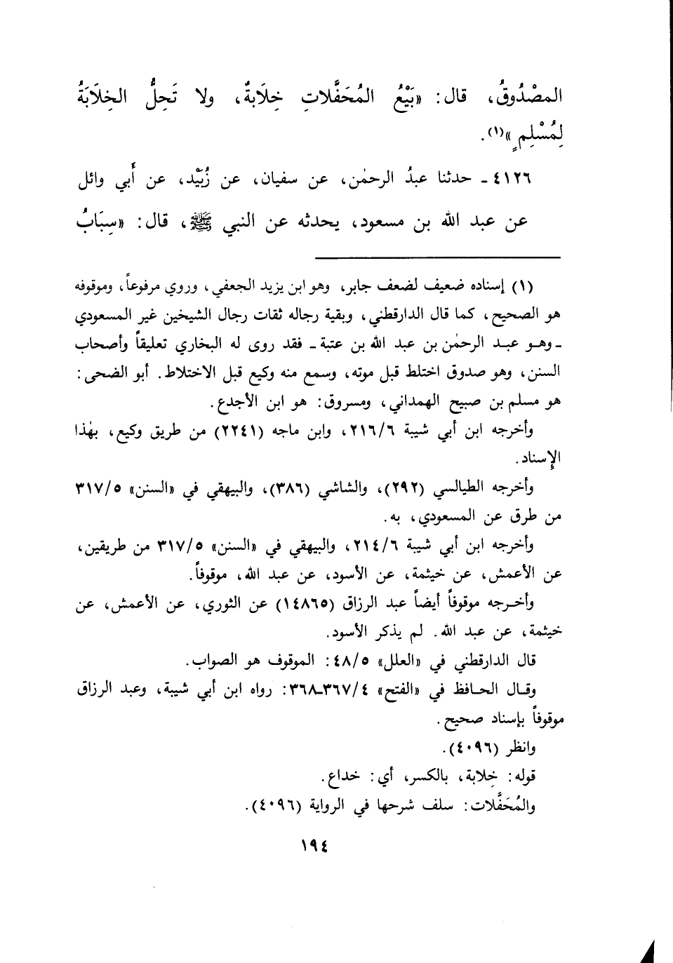 ٤١٢٦ - حَدَّثَنَا عَبْدُ الرَّحْمَنِ، عَنْ سُفْيَانَ، عَنْ زُبَيْدٍ، عَنْ أَبِي وَائِلٍ، عَنْ عَبْدِ اللهِ بْنِ مَسْعُودٍ، يُحَدِّثُهُ عَنِ النَّبِيِّ صَلَّى اللهُ عَلَيْهِ وَسَلَّمَ، قَالَ: " سِبَابُ