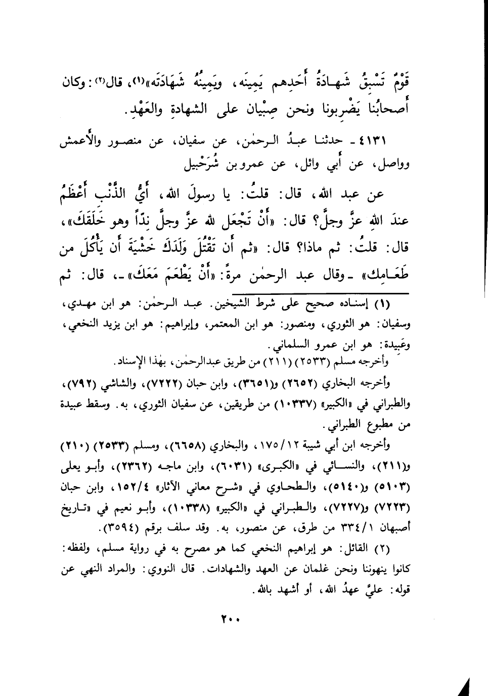 ٤١٣١ - حَدَّثَنَا عَبْدُ الرَّحْمَنِ، عَنْ سُفْيَانَ، عَنْ مَنْصُورٍ، وَالْأَعْمَشُ، وَوَاصِلٌ، عَنْ أَبِي وَائِلٍ، عَنْ عَمْرِو بْنِ شُرَحْبِيلَ، عَنْ عَبْدِ اللهِ، قَالَ: قُلْتُ: يَا رَسُولَ اللهِ، أَيُّ الذَّنْبِ أَعْظَمُ عِنْدَ اللهِ عَزَّ وَجَلَّ؟ قَالَ: " أَنْ تَجْعَلَ لِلَّهِ عَزَّ وَجَلَّ نِدًّا، وَهُوَ خَلَقَكَ "، قَالَ: قُلْتُ: ثُمَّ مَاذَا؟ قَالَ: " ثُمَّ أَنْ تَقْتُلَ وَلَدَكَ خَشْيَةَ أَنْ يَأْكُلَ مِنْ طَعَامِكَ " - وَقَالَ عَبْدُ الرَّحْمَنِ مَرَّةً: " أَنْ يَطْعَمَ مَعَكَ " -، قَالَ: ثُمَّ