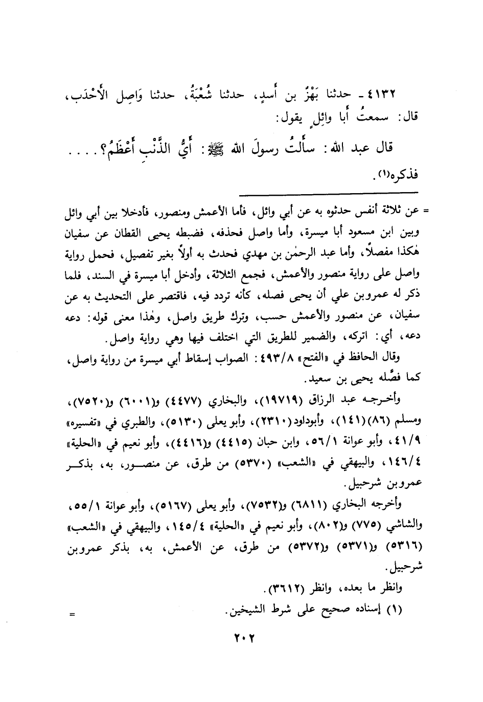 ٤١٣٢ - حَدَّثَنَا بَهْزُ بْنُ أَسَدٍ، حَدَّثَنَا شُعْبَةُ، حَدَّثَنَا وَاصِلٌ الْأَحْدَبُ، قَالَ: سَمِعْتُ أَبَا وَائِلٍ، يَقُولُ: قَالَ عَبْدُ اللهِ: سَأَلْتُ رَسُولَ اللهِ صَلَّى اللهُ عَلَيْهِ وَسَلَّمَ أَيُّ الذَّنْبِ أَعْظَمُ؟ فَذَكَرَهُ، (١)