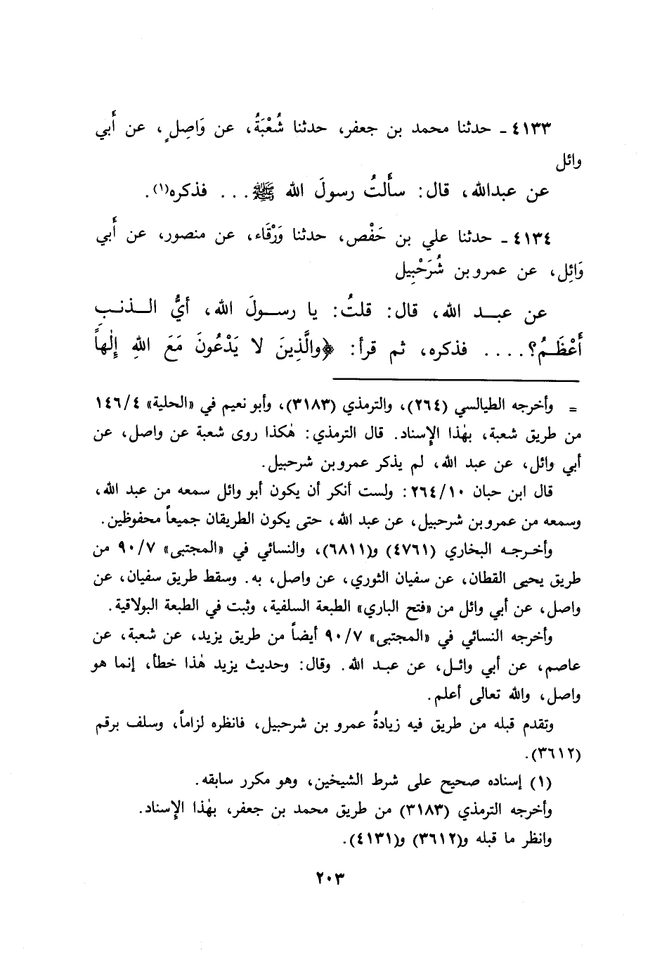 ٤١٣٤ - حَدَّثَنَا عَلِيُّ بْنُ حَفْصٍ، حَدَّثَنَا وَرْقَاءُ، عَنْ مَنْصُورٍ، عَنْ أَبِي وَائِلٍ، عَنْ عَمْرِو بْنِ شُرَحْبِيلَ، عَنْ عَبْدِ اللهِ، قَالَ: قُلْتُ: يَا رَسُولَ اللهِ، أَيُّ الذَّنْبِ أَعْظَمُ؟ فَذَكَرَهُ، ثُمَّ قَرَأَ: {وَالَّذِينَ لَا يَدْعُونَ مَعَ اللهِ إِلَهًا