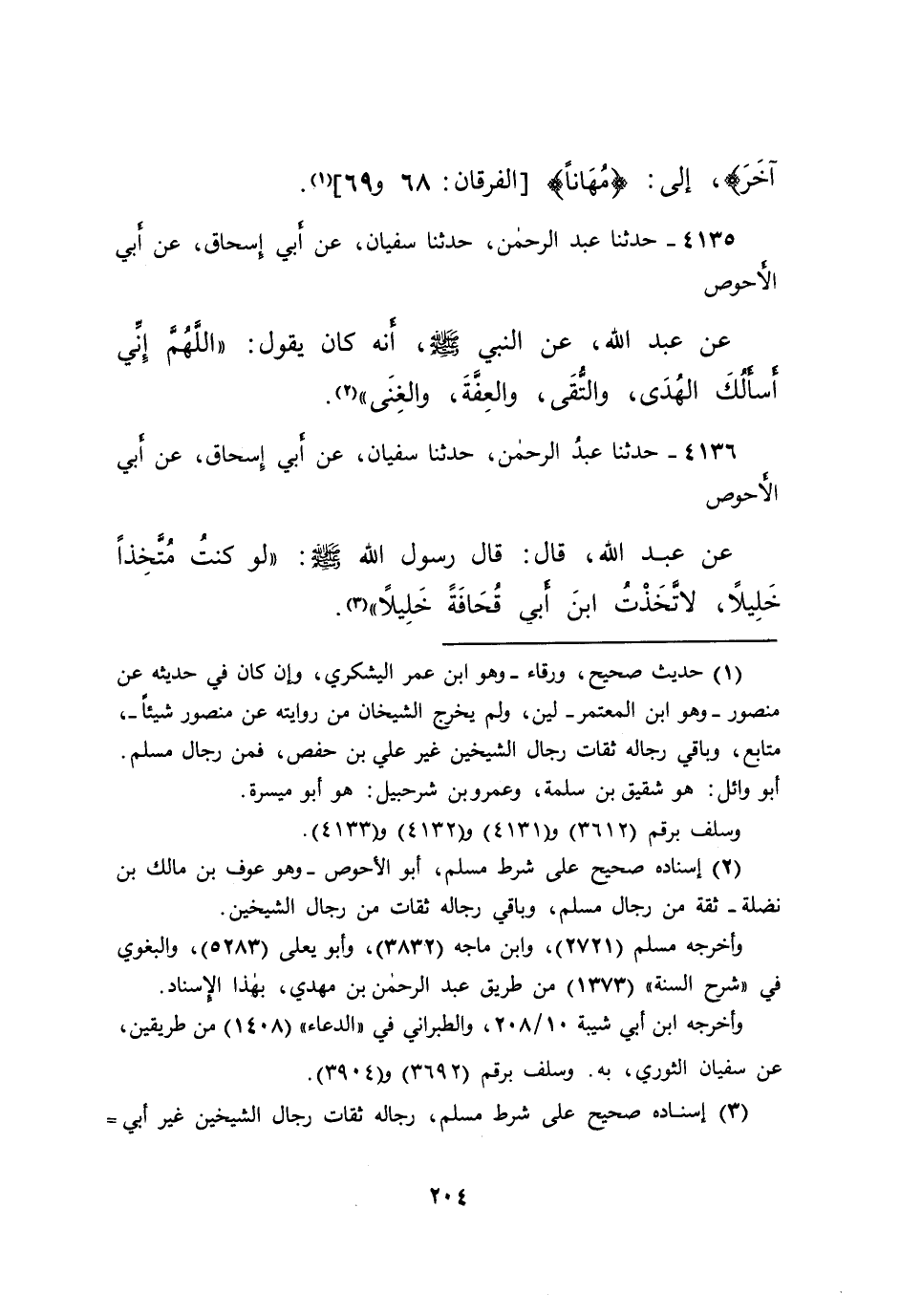 ٤١٣٥ - حَدَّثَنَا عَبْدُ الرَّحْمَنِ، حَدَّثَنَا سُفْيَانُ، عَنْ أَبِي إِسْحَاقَ، عَنْ أَبِي الْأَحْوَصِ، عَنْ عَبْدِ اللهِ، عَنِ النَّبِيِّ صَلَّى اللهُ عَلَيْهِ وَسَلَّمَ، أَنَّهُ كَانَ يَقُولُ: " اللهُمَّ إِنِّي أَسْأَلُكَ الْهُدَى، وَالتُّقَى، وَالْعِفَّةَ، وَالْغِنَى " (٢)