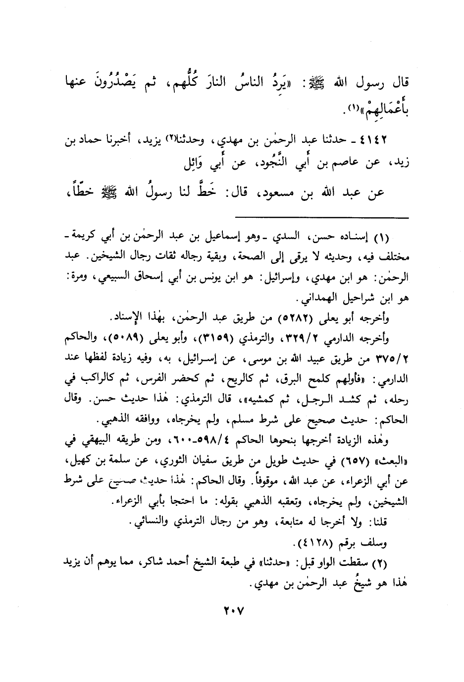 ٤١٤٢ - حَدَّثَنَا عَبْدُ الرَّحْمَنِ بْنُ مَهْدِيٍّ، وَحَدَّثَنَا (٢) يَزِيدُ، أَخْبَرَنَا حَمَّادُ بْنُ زَيْدٍ، عَنْ عَاصِمِ بْنِ أَبِي النَّجُودِ، عَنْ أَبِي وَائِلٍ، عَنْ عَبْدِ اللهِ بْنِ مَسْعُودٍ، قَالَ: خَطَّ لَنَا رَسُولُ اللهِ صَلَّى اللهُ عَلَيْهِ وَسَلَّمَ خَطًّا،