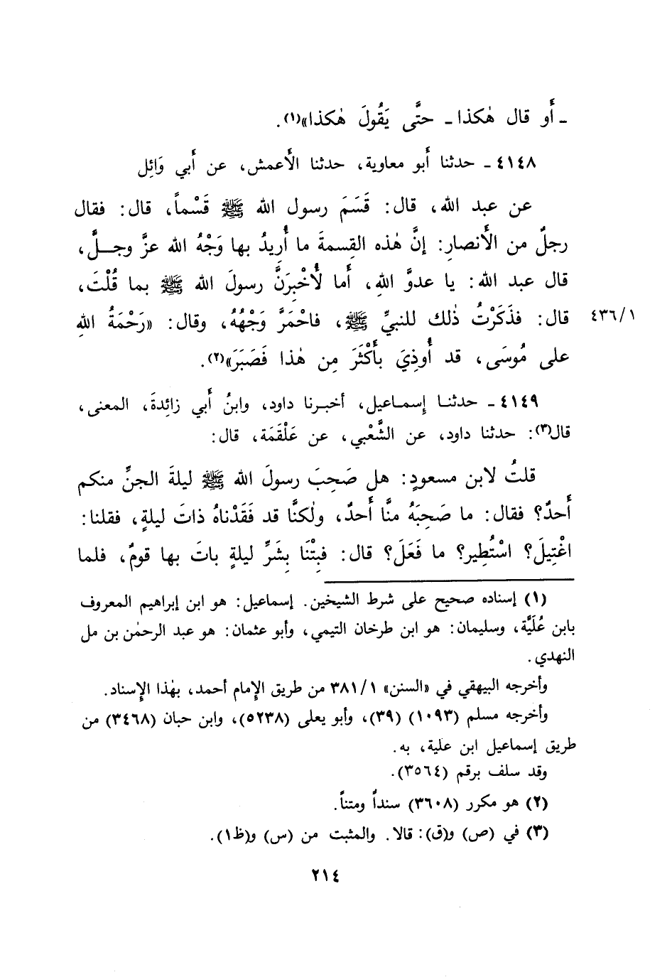 ٤١٤٨ - حَدَّثَنَا أَبُو مُعَاوِيَةَ، حَدَّثَنَا الْأَعْمَشُ، عَنْ أَبِي وَائِلٍ، عَنْ عَبْدِ اللهِ، قَالَ: قَسَمَ رَسُولُ اللهِ صَلَّى اللهُ عَلَيْهِ وَسَلَّمَ قَسْمًا، قَالَ: فَقَالَ رَجُلٌ مِنَ الْأَنْصَارِ: إِنَّ هَذِهِ الْقِسْمَةَ مَا أُرِيدَ بِهَا وَجْهُ اللهِ عَزَّ وَجَلَّ، قَالَ عَبْدُ اللهِ: يَا عَدُوَّ اللهِ، أَمَا لَأُخْبِرَنَّ رَسُولَ اللهِ صَلَّى اللهُ عَلَيْهِ وَسَلَّمَ بِمَا قُلْتَ، قَالَ: فَذَكَرْتُ ذَلِكَ لِلنَّبِيِّ صَلَّى اللهُ عَلَيْهِ وَسَلَّمَ، فَاحْمَرَّ وَجْهُهُ، وَقَالَ: " رَحْمَةُ اللهِ عَلَى مُوسَى، قَدْ أُوذِيَ بِأَكْثَرَ مِنْ هَذَا فَصَبَرَ " (٢)