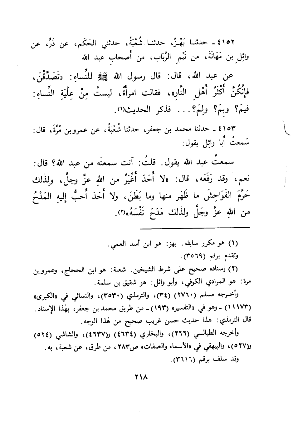 ٤١٥٣ - حَدَّثَنَا مُحَمَّدُ بْنُ جَعْفَرٍ، حَدَّثَنَا شُعْبَةُ، عَنْ عَمْرِو بْنِ مُرَّةَ، قَالَ: سَمِعْتُ أَبَا وَائِلٍ، يَقُولُ: سَمِعْتُ عَبْدَ اللهِ، يَقُولُ: - قُلْتُ: أَنْتَ سَمِعْتَهُ مِنْ عَبْدِ اللهِ؟ قَالَ: نَعَمْ، وَقَدْ رَفَعَهُ - قَالَ: " لَا أَحَدَ أَغْيَرُ مِنَ اللهِ عَزَّ وَجَلَّ، وَلِذَلِكَ حَرَّمَ الْفَوَاحِشَ مَا ظَهَرَ مِنْهَا وَمَا بَطَنَ، وَلَا أَحَدَ أَحَبُّ إِلَيْهِ الْمَدْحُ مِنَ اللهِ عَزَّ وَجَلَّ وَلِذَلِكَ مَدَحَ نَفْسَهُ " (٢)