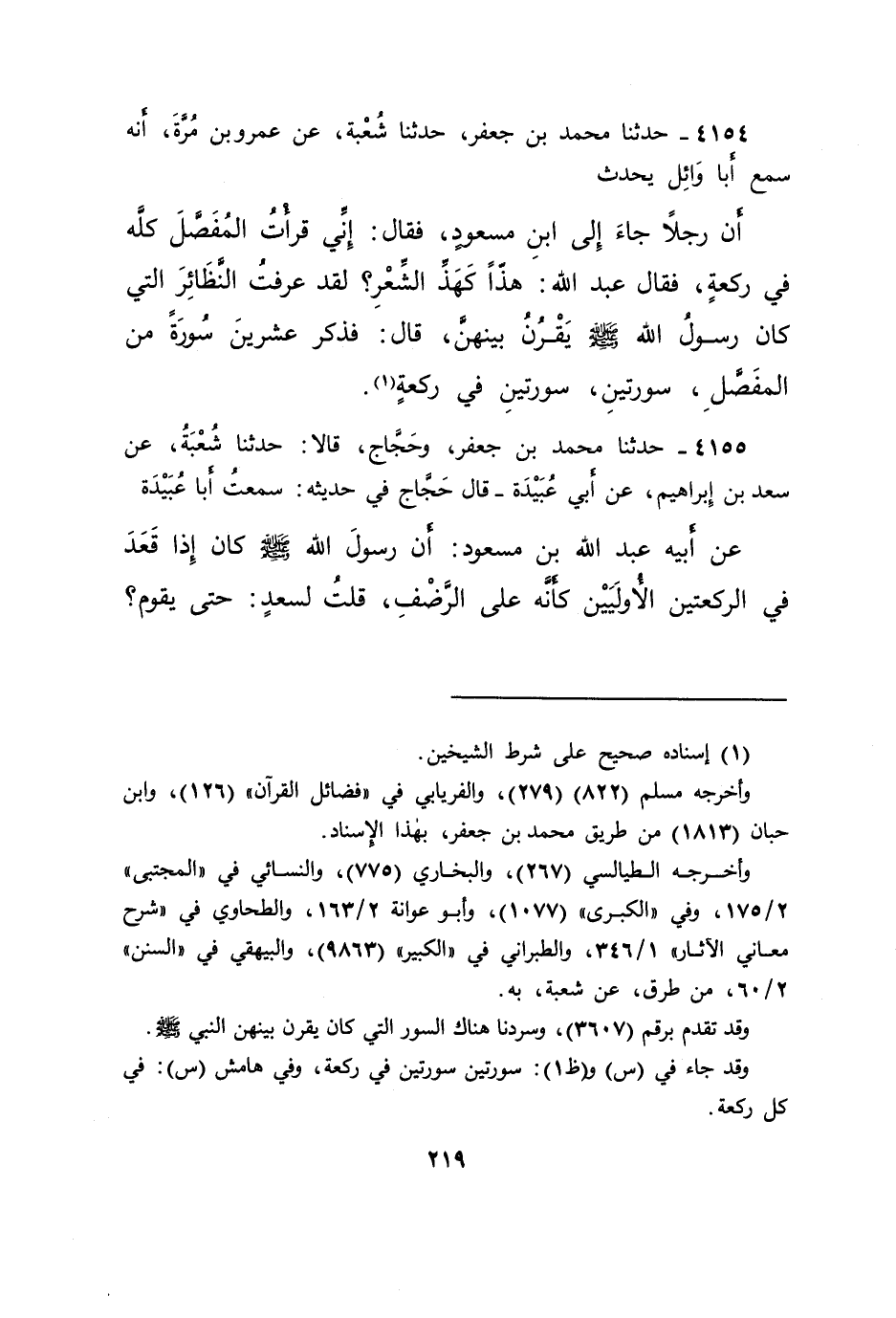 ٤١٥٤ - حَدَّثَنَا مُحَمَّدُ بْنُ جَعْفَرٍ، حَدَّثَنَا شُعْبَةُ، عَنْ عَمْرِو بْنِ مُرَّةَ، أَنَّهُ سَمِعَ أَبَا وَائِلٍ، يُحَدِّثُ، أَنَّ رَجُلًا جَاءَ إِلَى ابْنِ مَسْعُودٍ، فَقَالَ: إِنِّي قَرَأْتُ الْمُفَصَّلَ كُلَّهُ فِي رَكْعَةٍ، فَقَالَ عَبْدُ اللهِ: هَذًّا كَهَذِّ الشِّعْرِ؟ " لَقَدْ عَرَفْتُ النَّظَائِرَ الَّتِي كَانَ رَسُولُ اللهِ صَلَّى اللهُ عَلَيْهِ وَسَلَّمَ يَقْرُنُ بَيْنَهُنَّ "، قَالَ: " فَذَكَرَ عِشْرِينَ سُورَةً مِنَ الْمُفَصَّلِ، سُورَتَيْنِ، سُورَتَيْنِ فِي كُلِّ رَكْعَةٍ " (١)