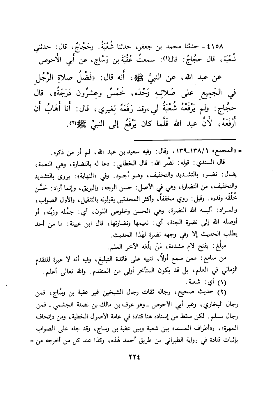 ٤١٥٨ - حَدَّثَنَا مُحَمَّدُ بْنُ جَعْفَرٍ، حَدَّثَنَا شُعْبَةُ، وَحَجَّاجٌ، قَالَ: حَدَّثَنِي شُعْبَةُ، قَالَ: حَجَّاجٌ قَالَ (١) : سَمِعْتُ عُقْبَةَ بْنَ وَسَّاجٍ، عَنْ أَبِي الْأَحْوَصِ، عَنْ عَبْدِ اللهِ، عَنِ النَّبِيِّ صَلَّى اللهُ عَلَيْهِ وَسَلَّمَ، أَنَّهُ قَالَ: " فَضْلُ صَلَاةِ الرَّجُلِ فِي الْجَمِيعِ، عَلَى صَلَاتِهِ وَحْدَهُ، خَمْسٌ وَعِشْرُونَ دَرَجَةً " قَالَ حَجَّاجٌ: " وَلَمْ يَرْفَعْهُ شُعْبَةُ لِي وَقَدْ رَفَعَهُ لِغَيْرِي، قَالَ: أَنَا أَهَابُ أَنْ أَرْفَعَهُ، لِأَنَّ عَبْدَ اللهِ قَلَّمَا كَانَ يَرْفَعُ إِلَى النَّبِيِّ صَلَّى اللهُ عَلَيْهِ وَسَلَّمَ " (٢)